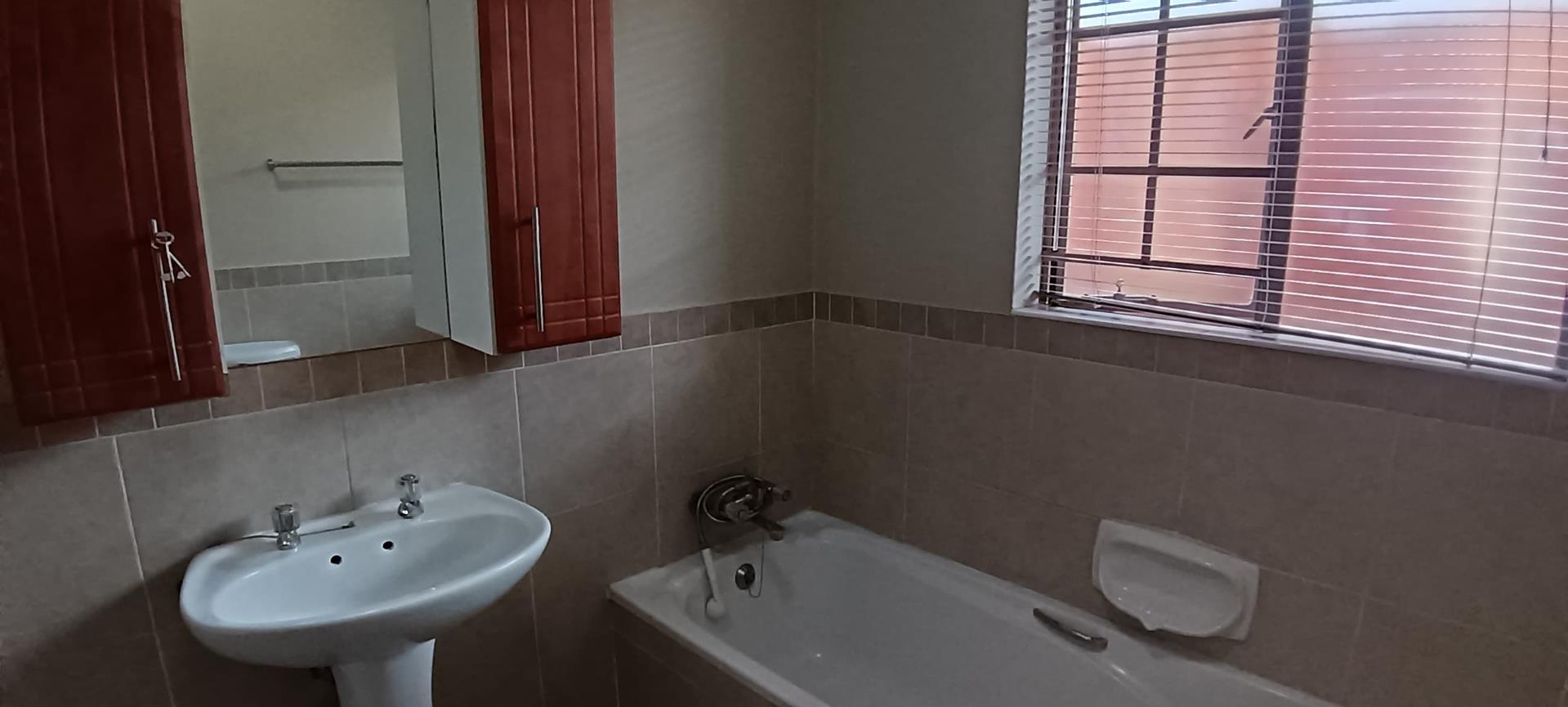 A full bathroom, complete with both a bath and shower, is complemented by built-in vanity cupboards and a mirror, ensuring functionality with a touch of elegance.
