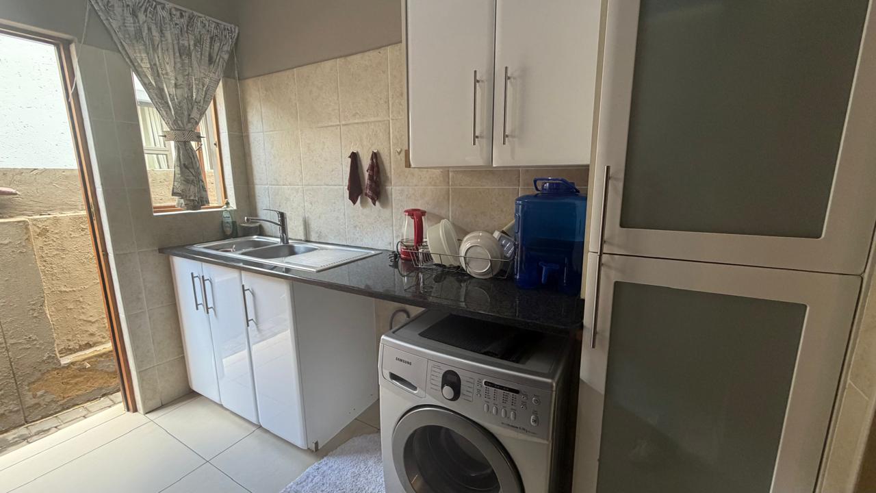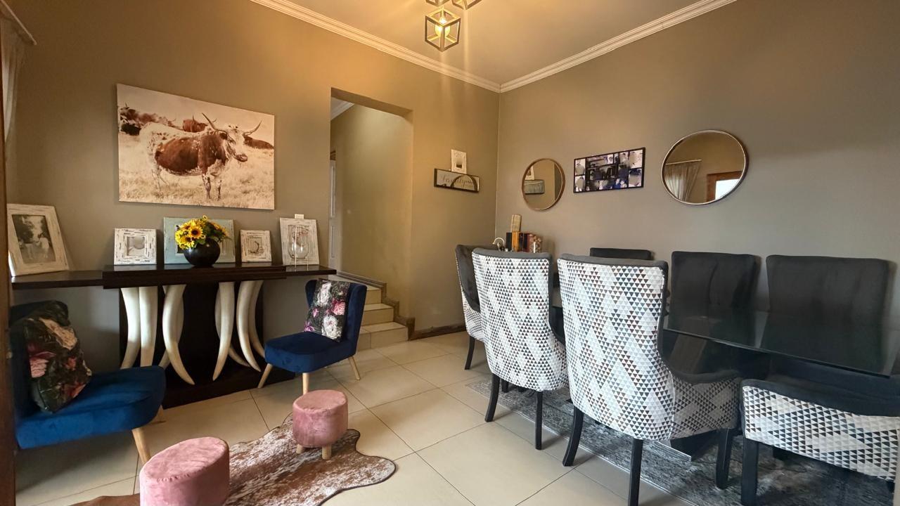 Step into an open-plan living space that seamlessly integrates a cozy lounge and a dining area, perfect for entertaining family and friends. The kitchen is a delight, featuring a spacious layout with a scullery and a sleek glass-top stove.