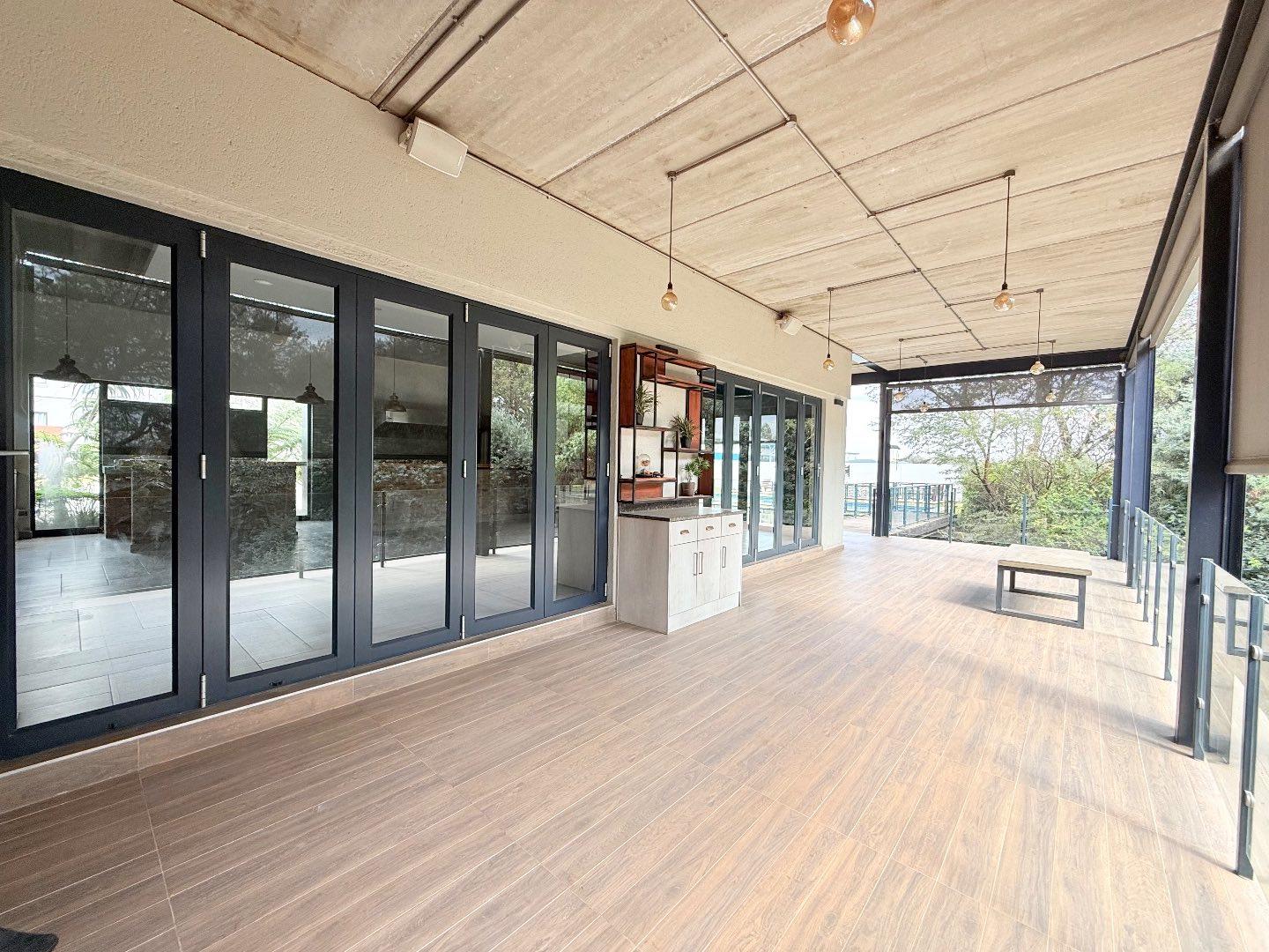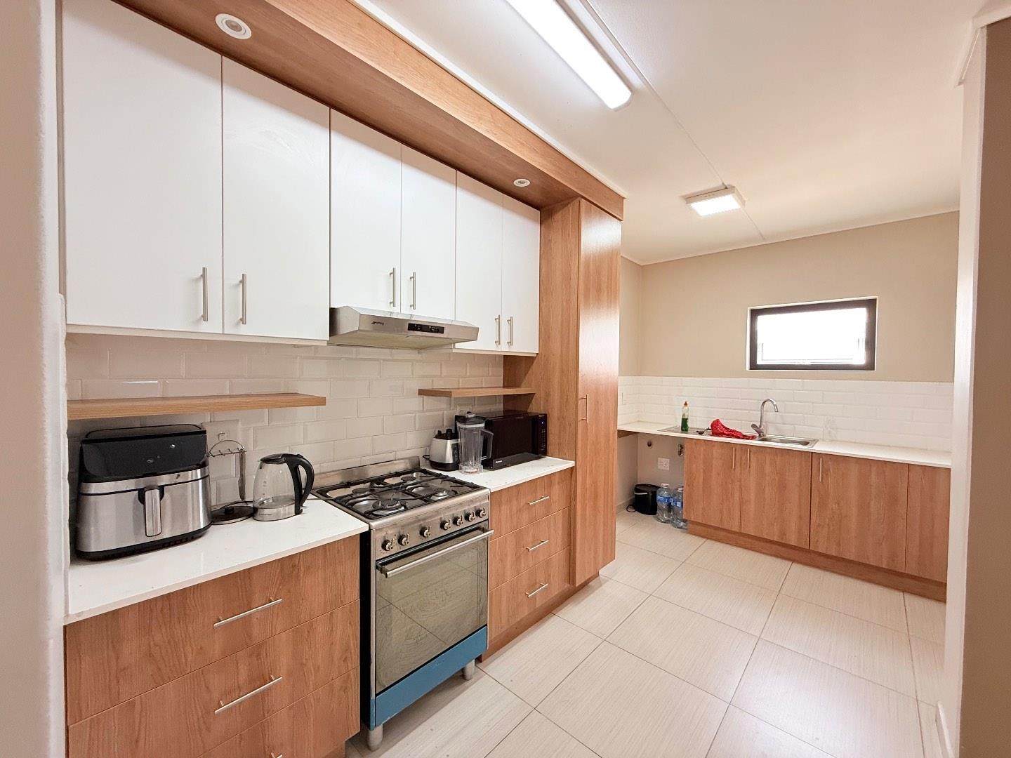Step inside to a spacious open-plan living area that beautifully merges the lounge and dining spaces. The kitchen is a chef's delight with sleek quartz countertops, a state-of-the-art gas stove, and a handy separate scullery.