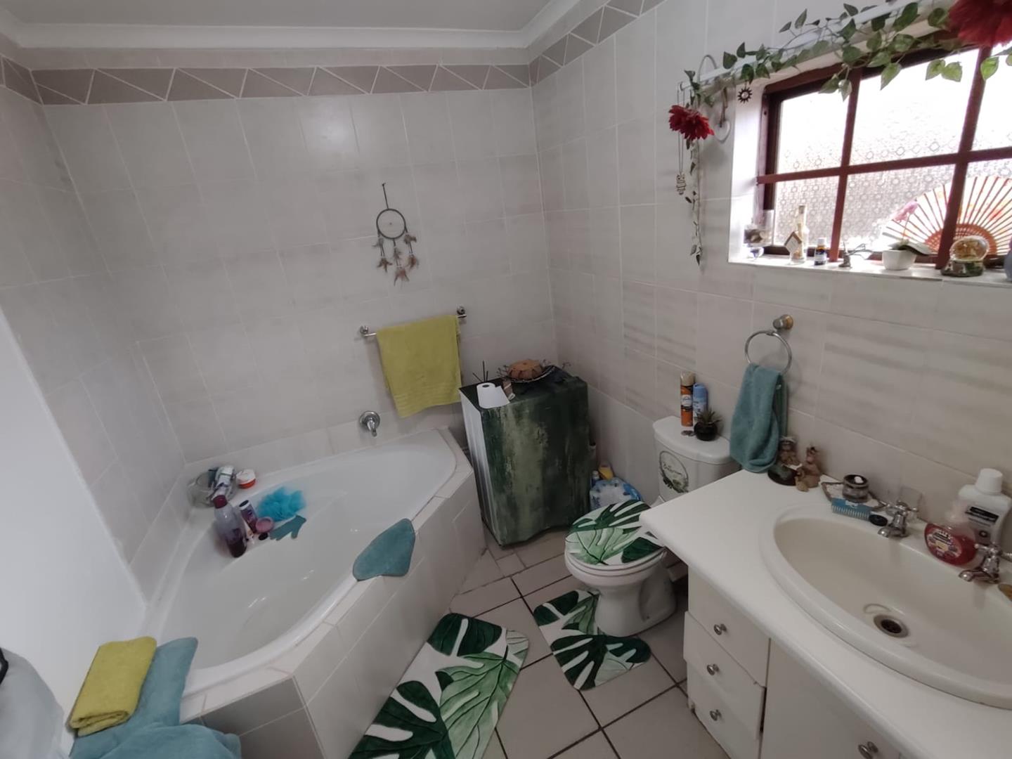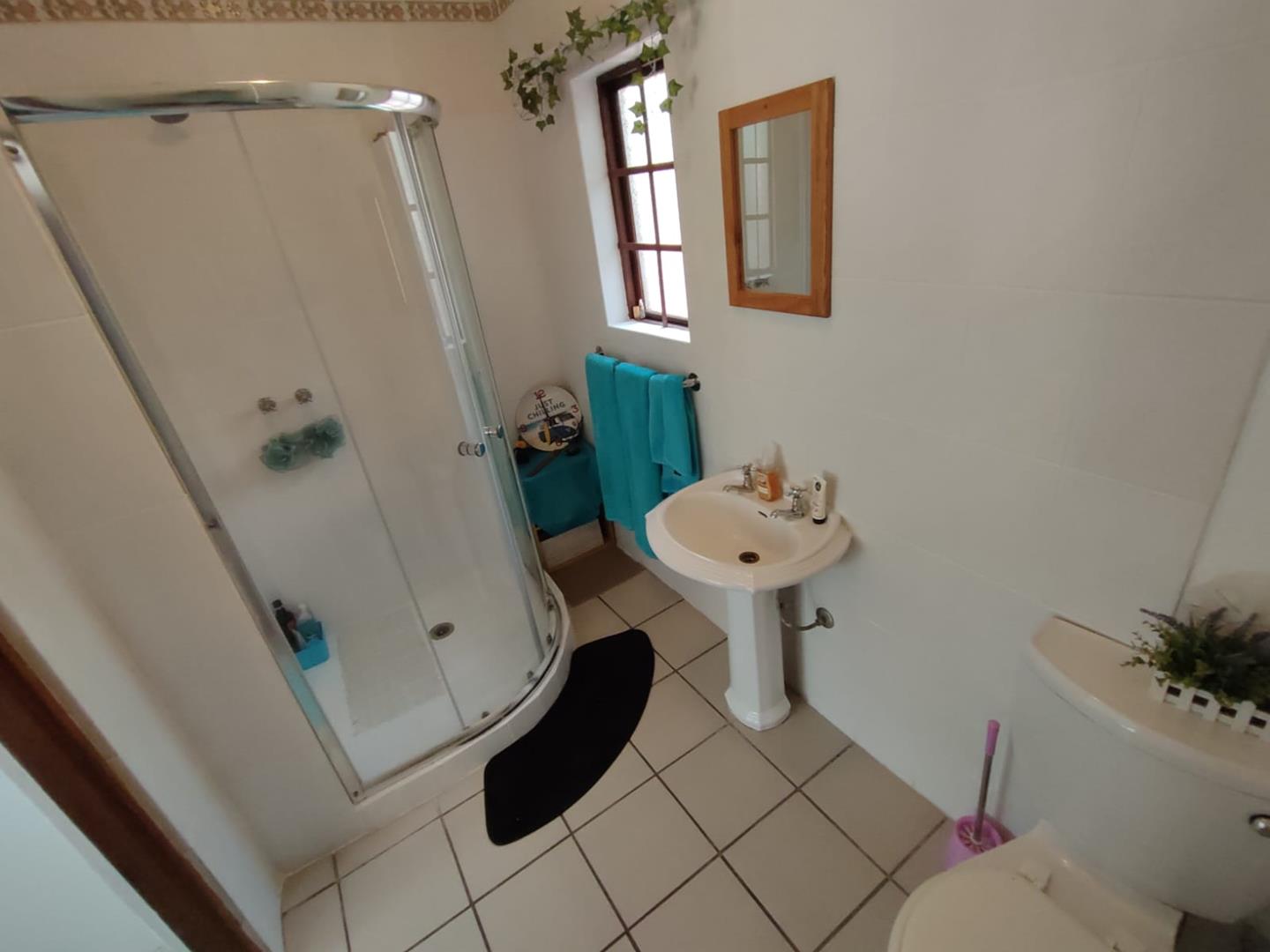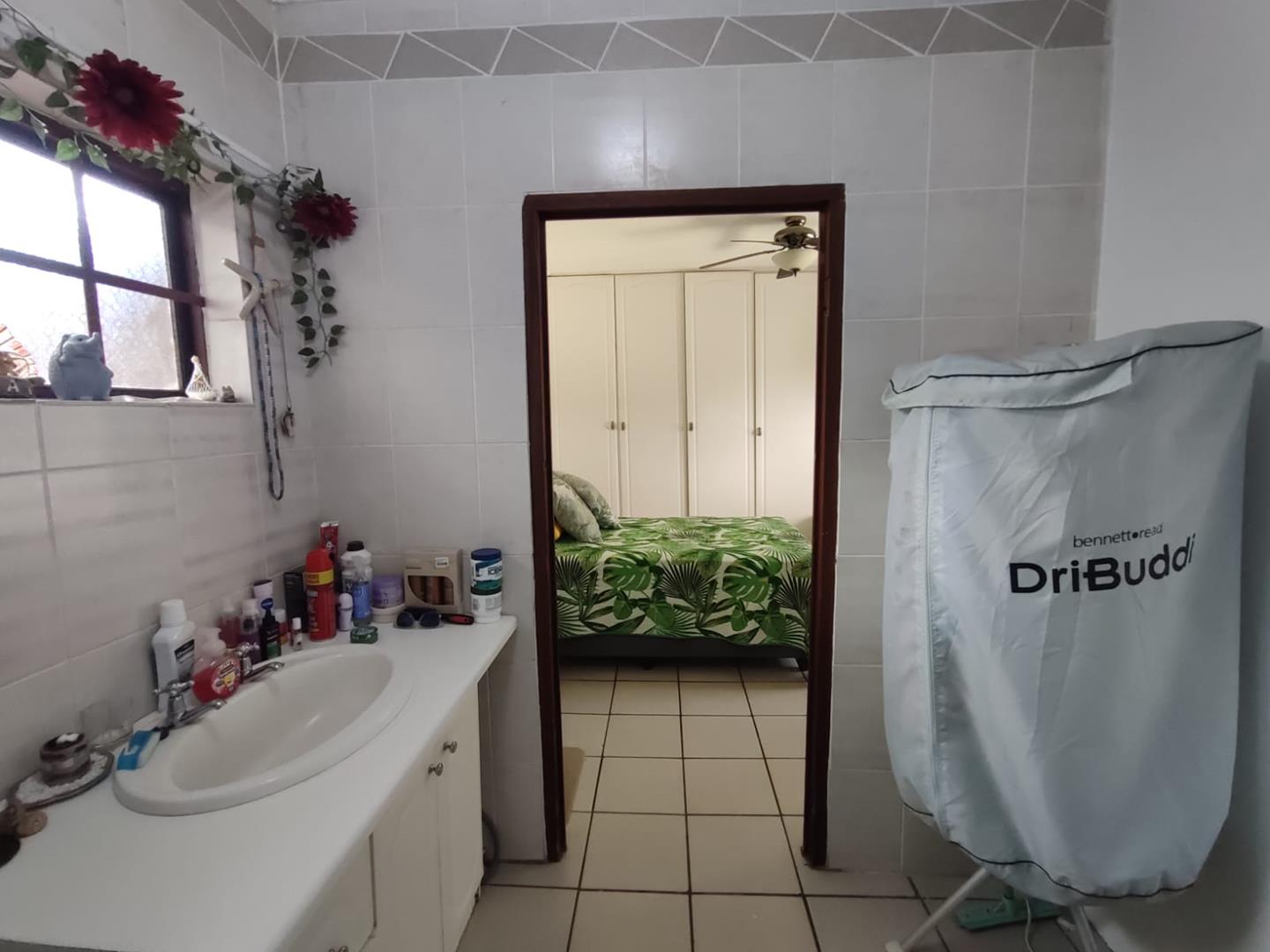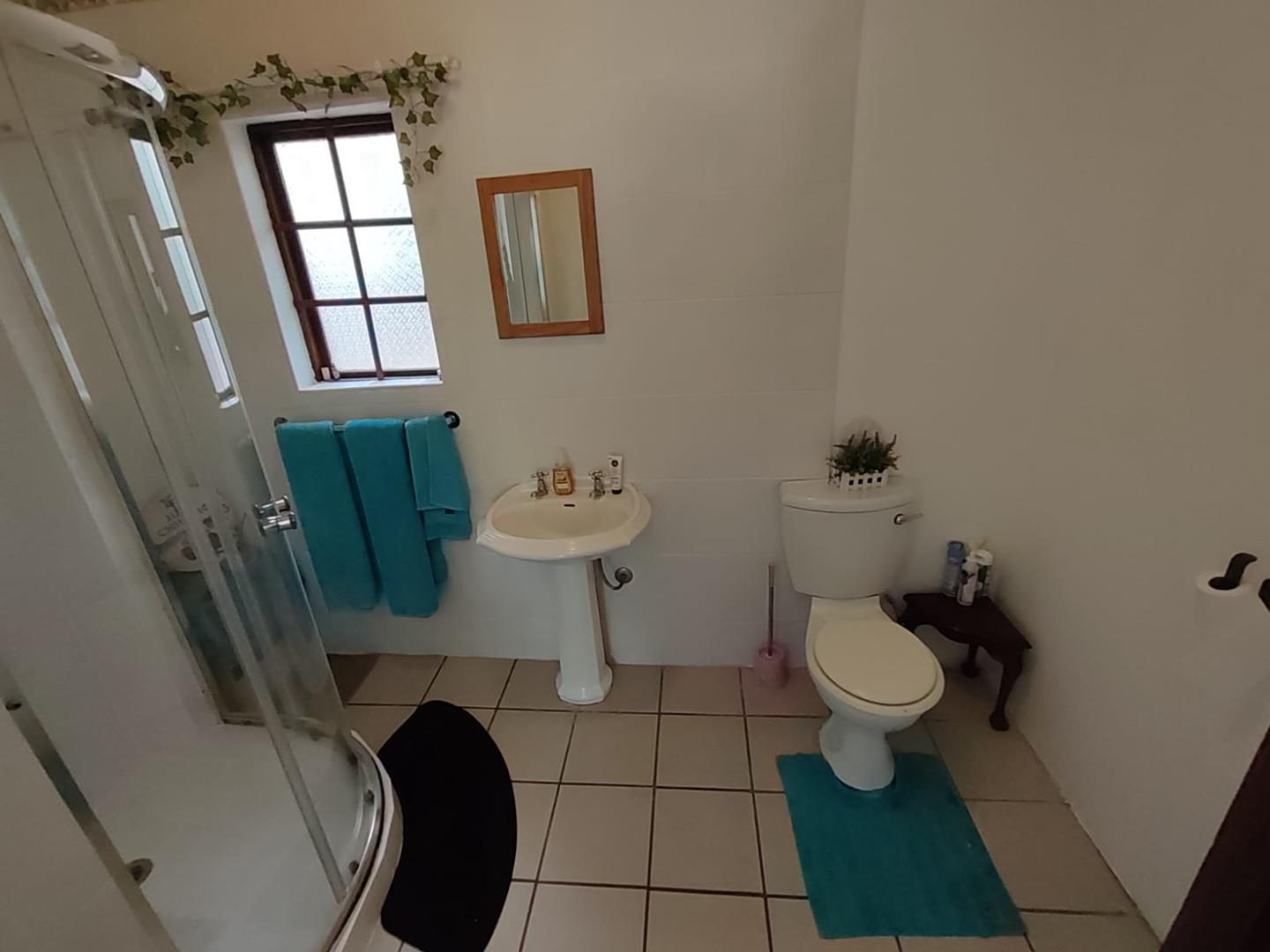 The main bedroom is a tranquil retreat featuring large windows that overlook the meticulously maintained garden. This en-suite boasts a bathroom complete with a bath, toilet, and basin, along with built-in cupboards for your convenience. Additionally, there is ample space to accommodate a washing machine. Two guest bedrooms share a separate shower, providing comfort and privacy for family and visitors alike.