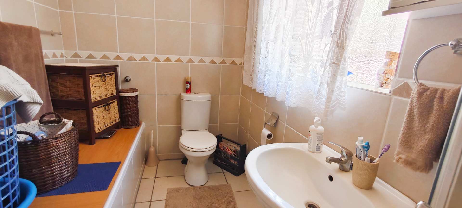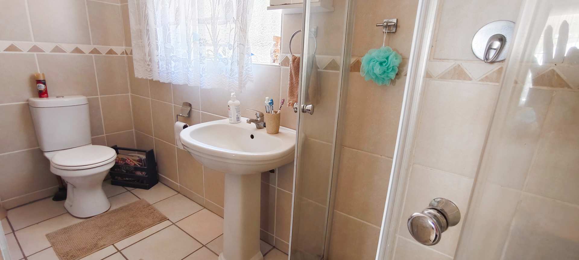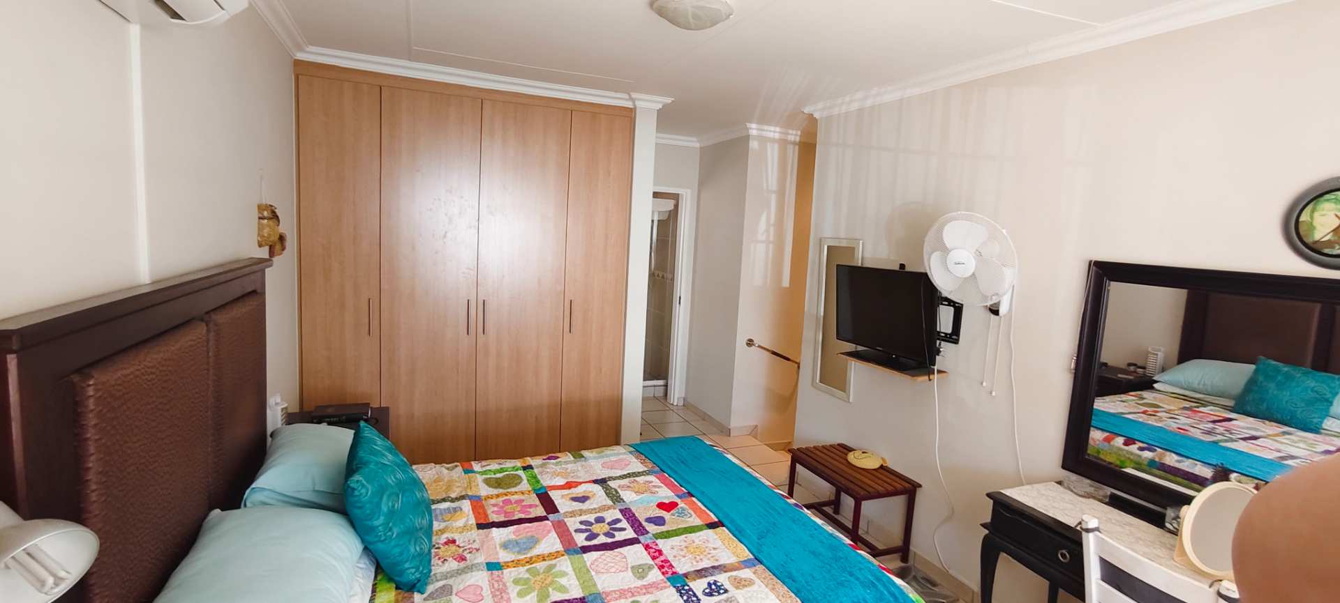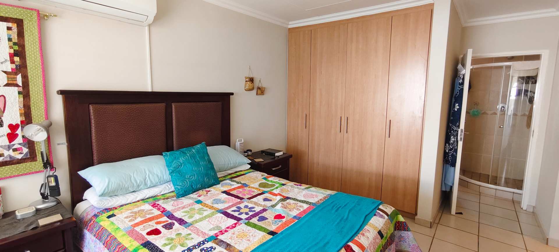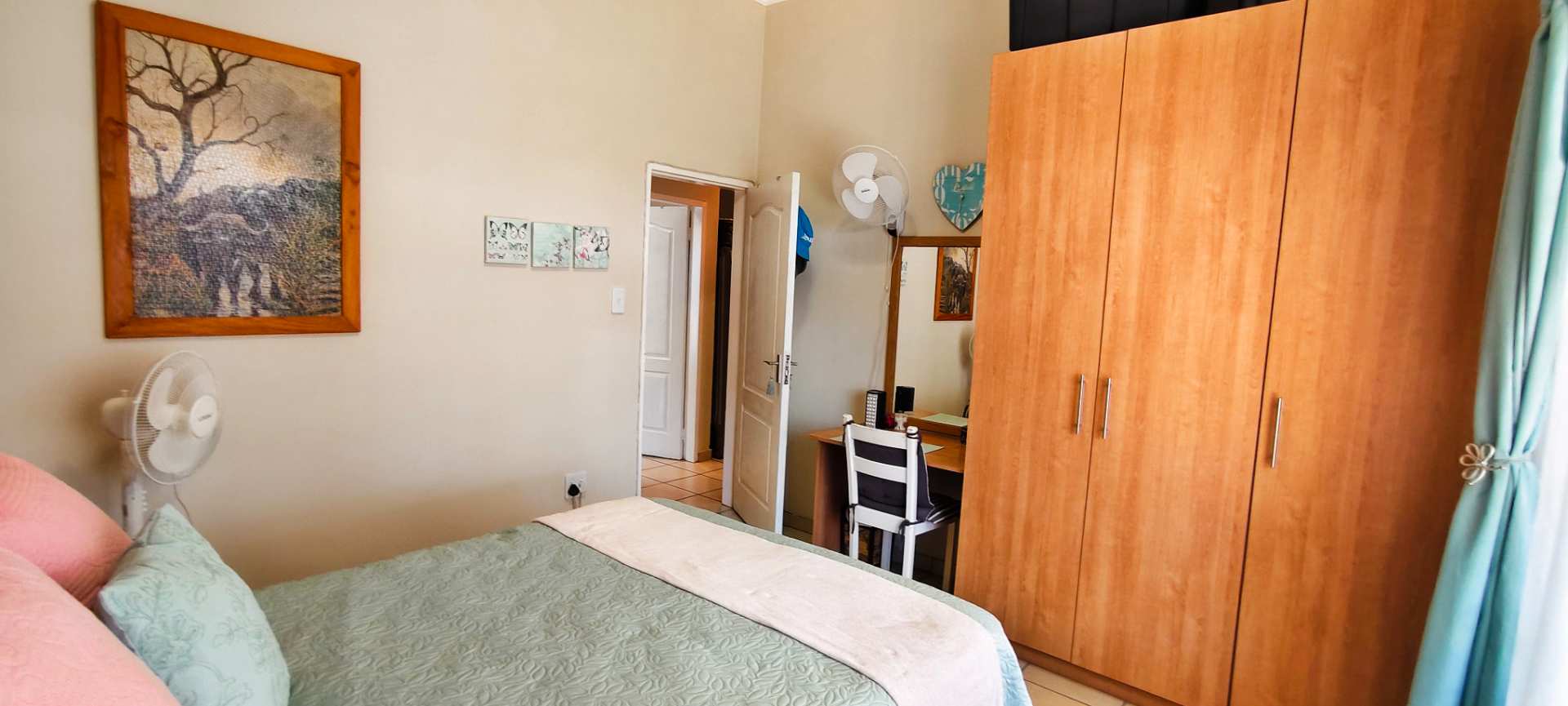 The property boasts three well-appointed bedrooms. Two guest bedrooms flank the passage and share a contemporary full bathroom, ensuring comfort and convenience for family or visitors. The main bedroom offers privacy and luxury, complete with an air conditioner and a full en-suite bathroom, positioned a few steps higher than the rest of the house for an added sense of seclusion.