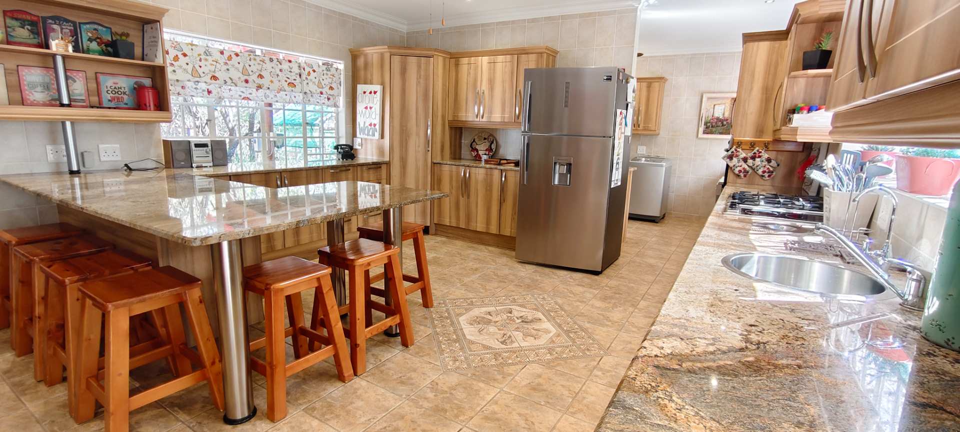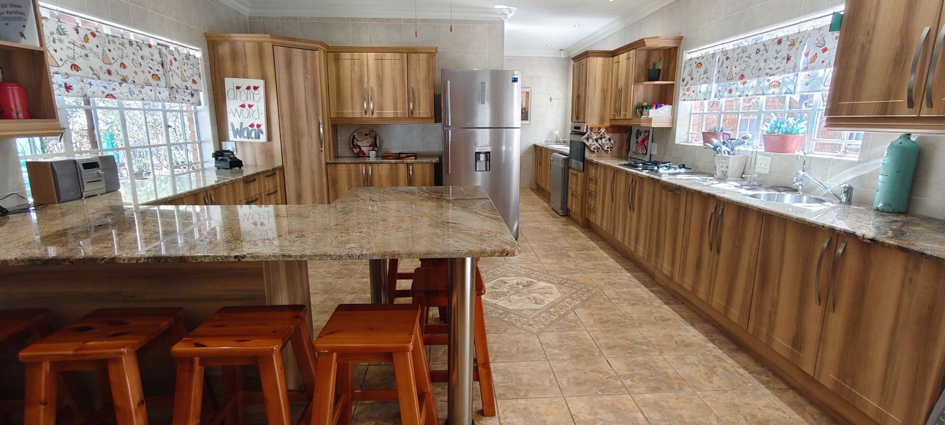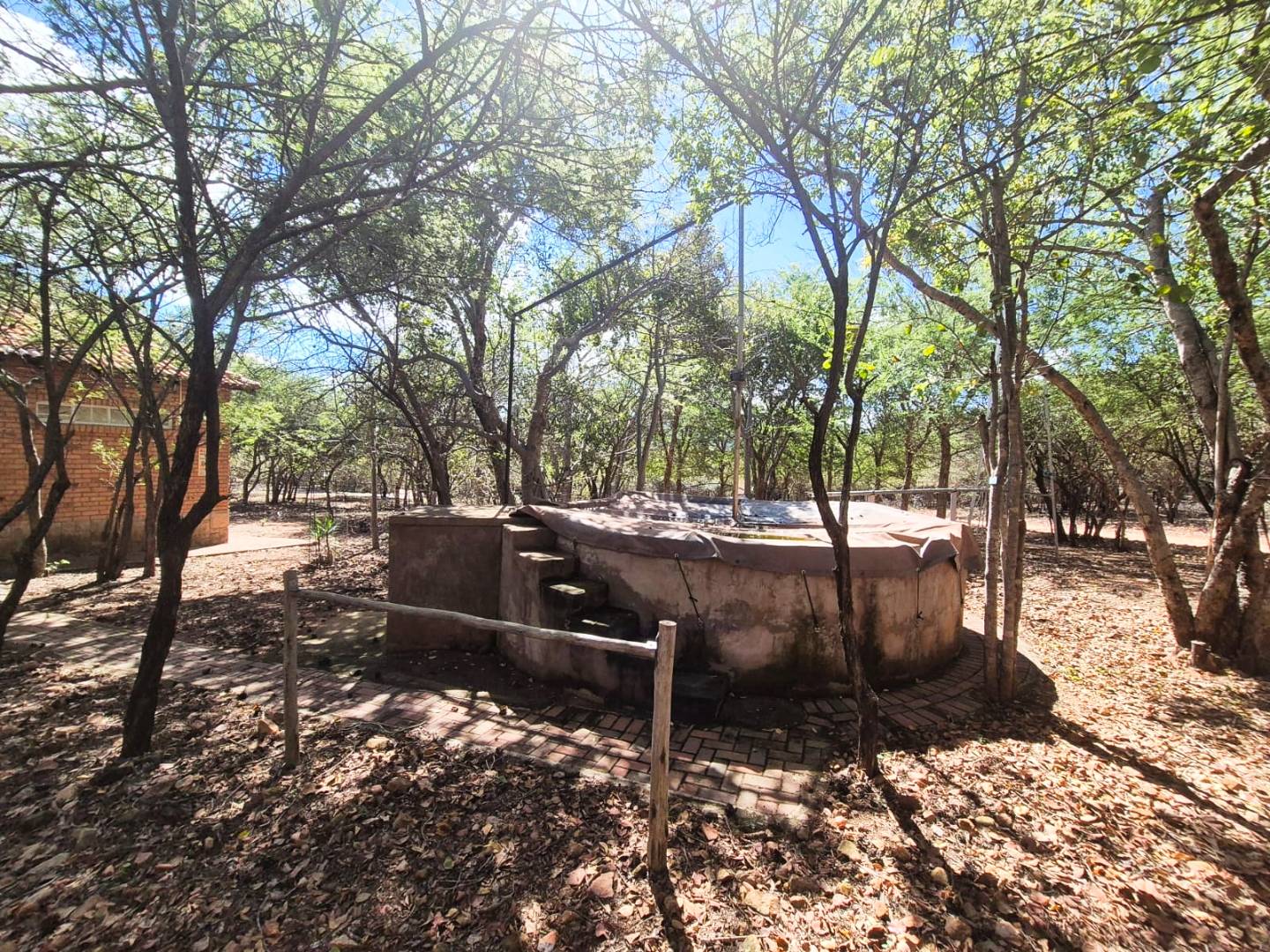 Further conveniences include Wendy house for extra storage, indoor and outdoor clotheslines, porche outdoor roller blinds for shade and privacy, and paved driveways around the house. For tranquil moments, visit the small church with IBR roofing and a water fountain. A 5KVA standby generator ensures uninterrupted power supply, while a large windmill from Karoo adds a picturesque touch to this stunning property.
