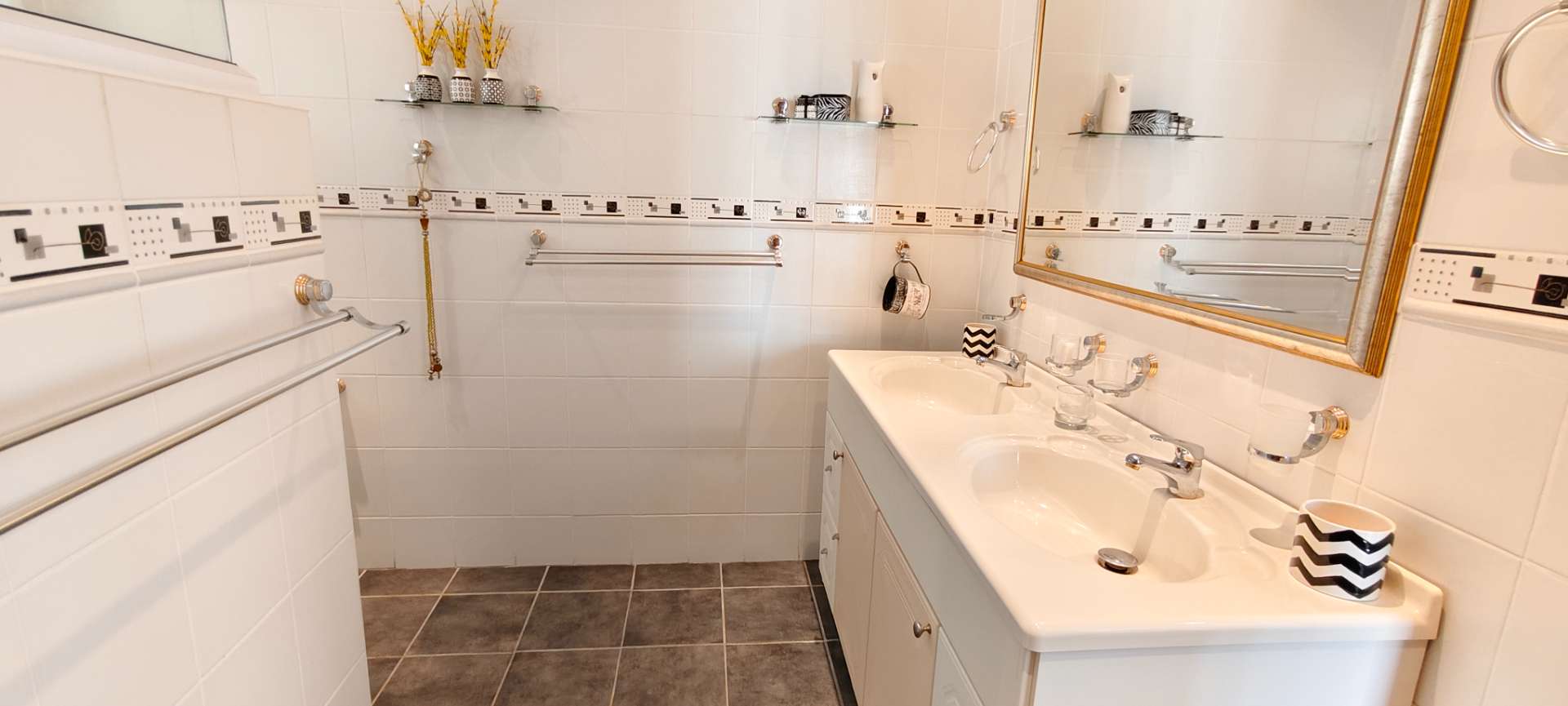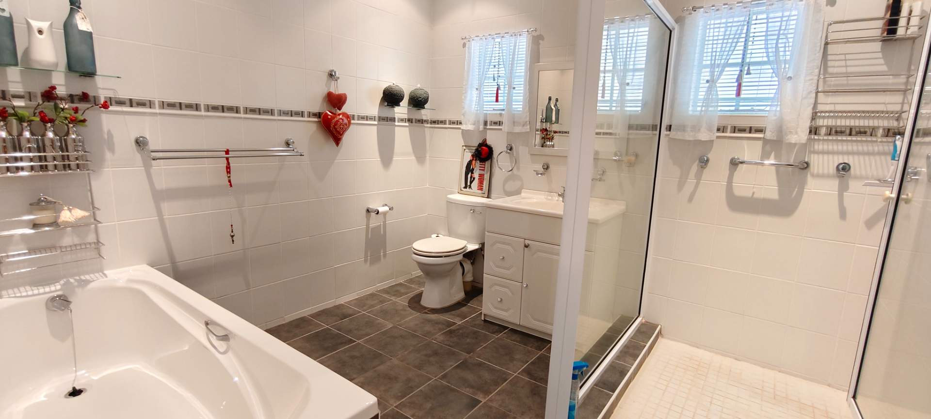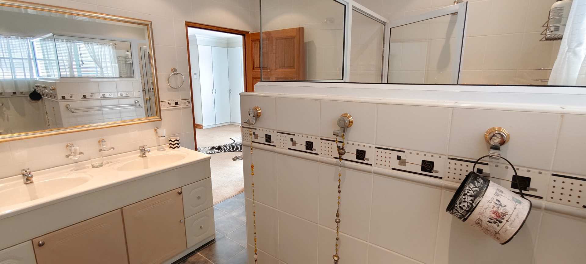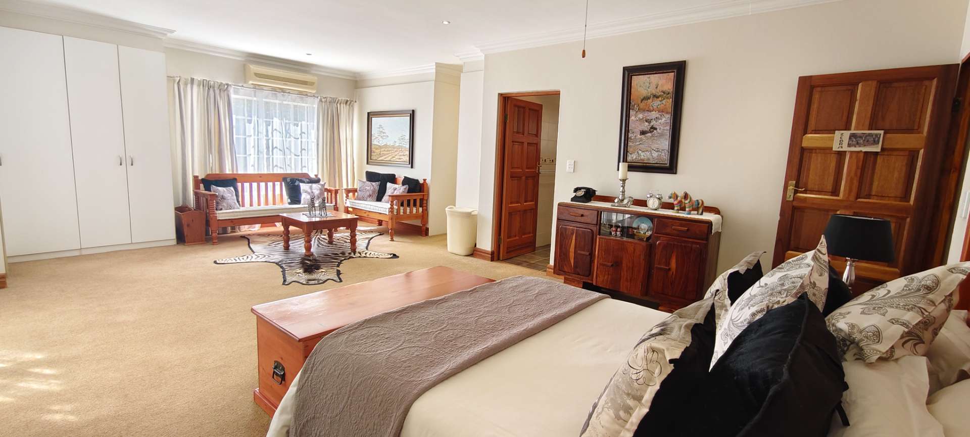 Inside the main house, you will find three roomy bedrooms, each fitted with air conditioners, downlights, and built-in cupboards. The main bedroom is particularly spacious, featuring a sliding door to an outdoor area, space for a private lounge, a walk-in dressing room, and an en-suite bathroom that is fully tiled with double basins, a shower, and a toilet. A full guest bathroom serves the additional bedrooms.
