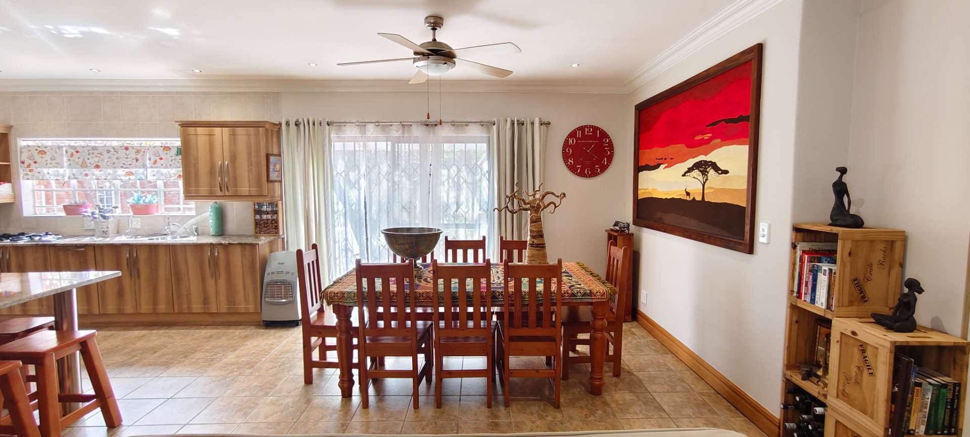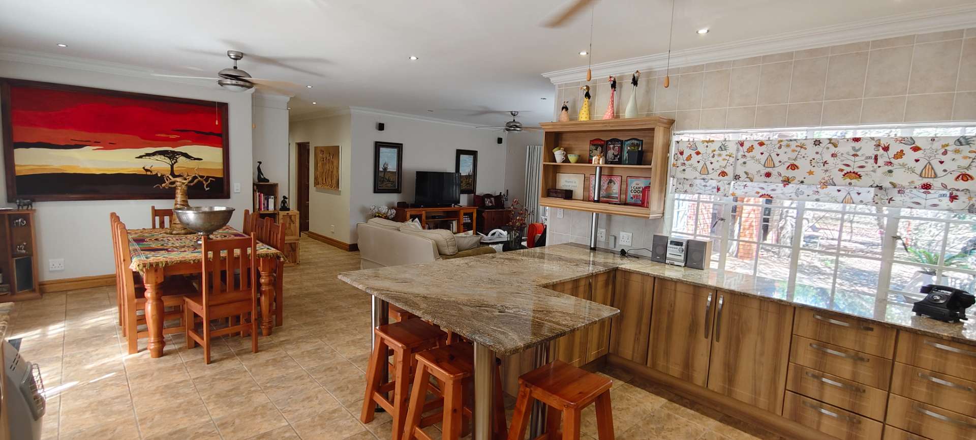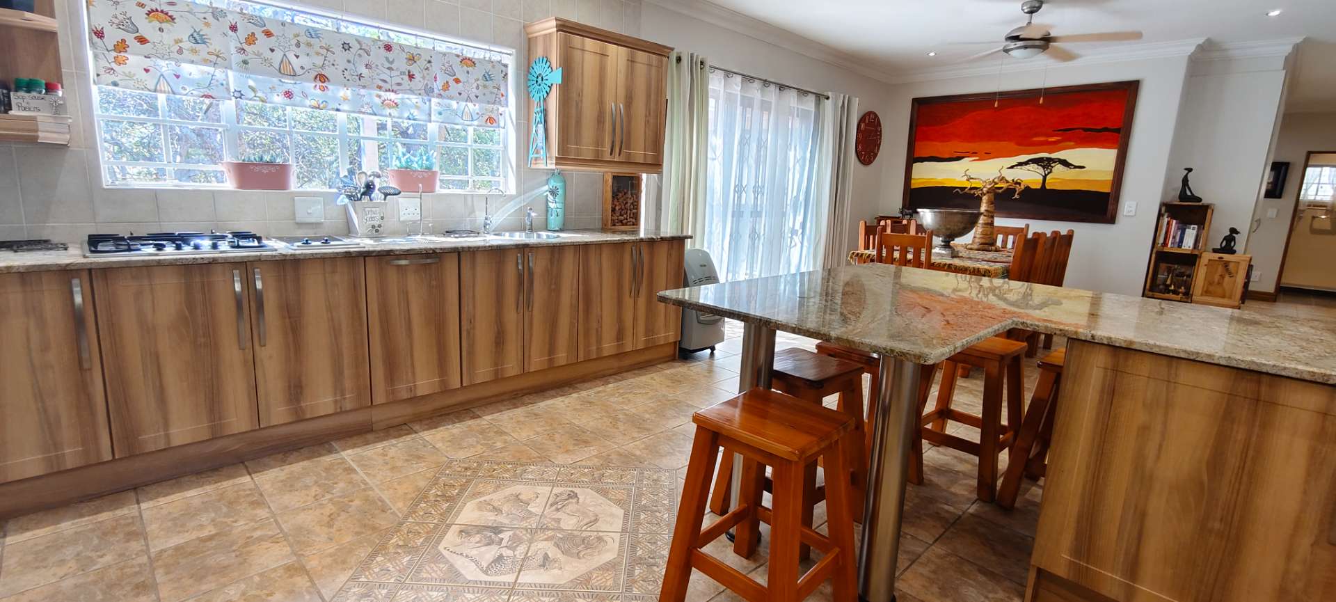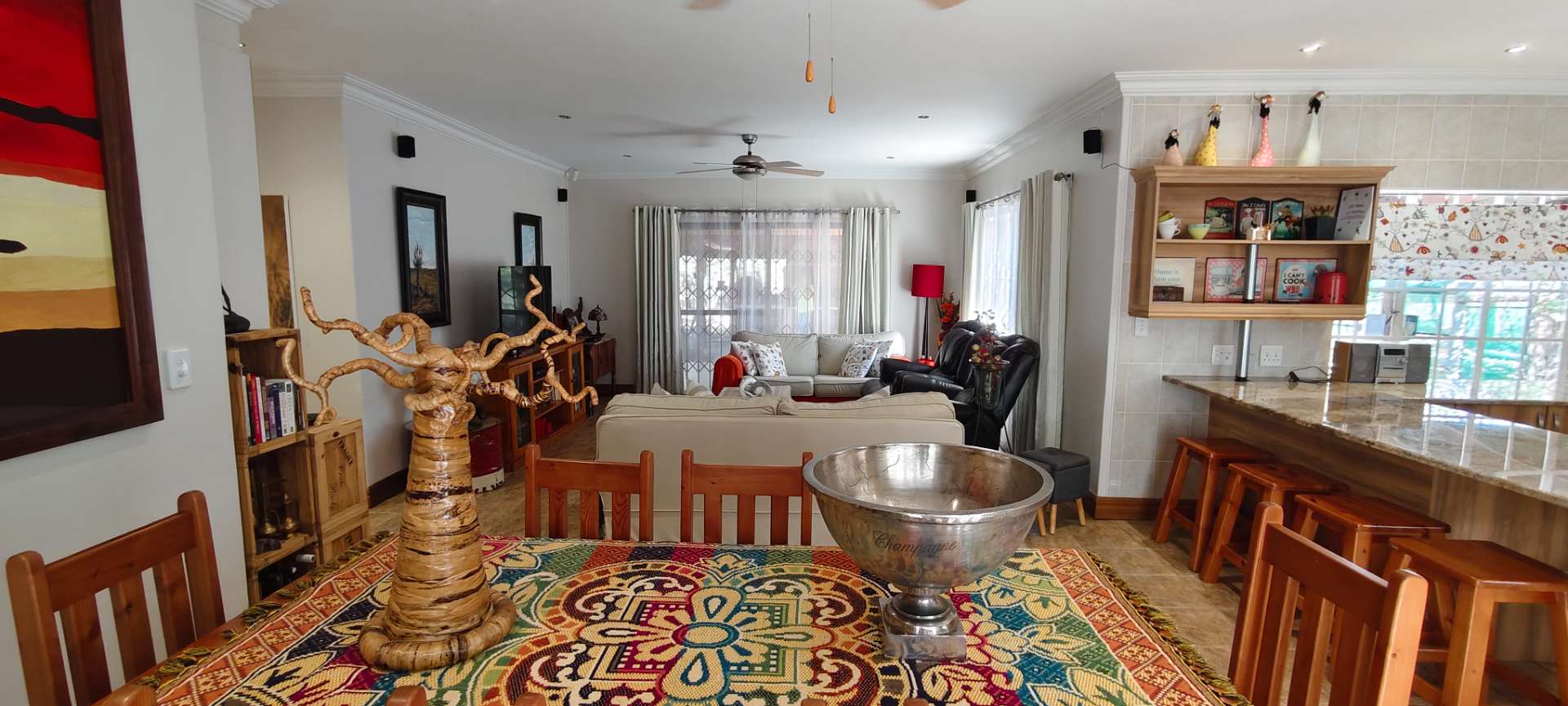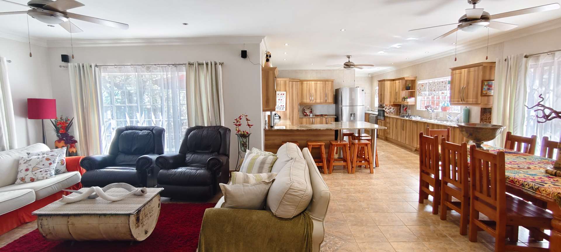 Step into a spacious open-plan living area that seamlessly combines the lounge, dining room, and kitchen, all enhanced with modern downlights and ceiling fans for optimal comfort. Sliding doors, equipped with insect screens and burglar bars, lead you from the lounge and dining room to exquisite entertainment areas, ensuring both safety and enjoyment.