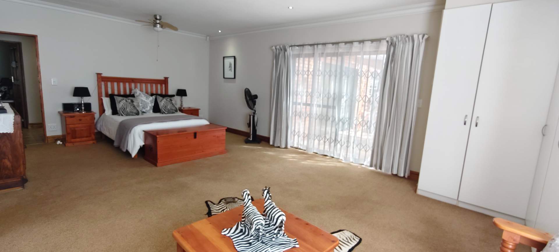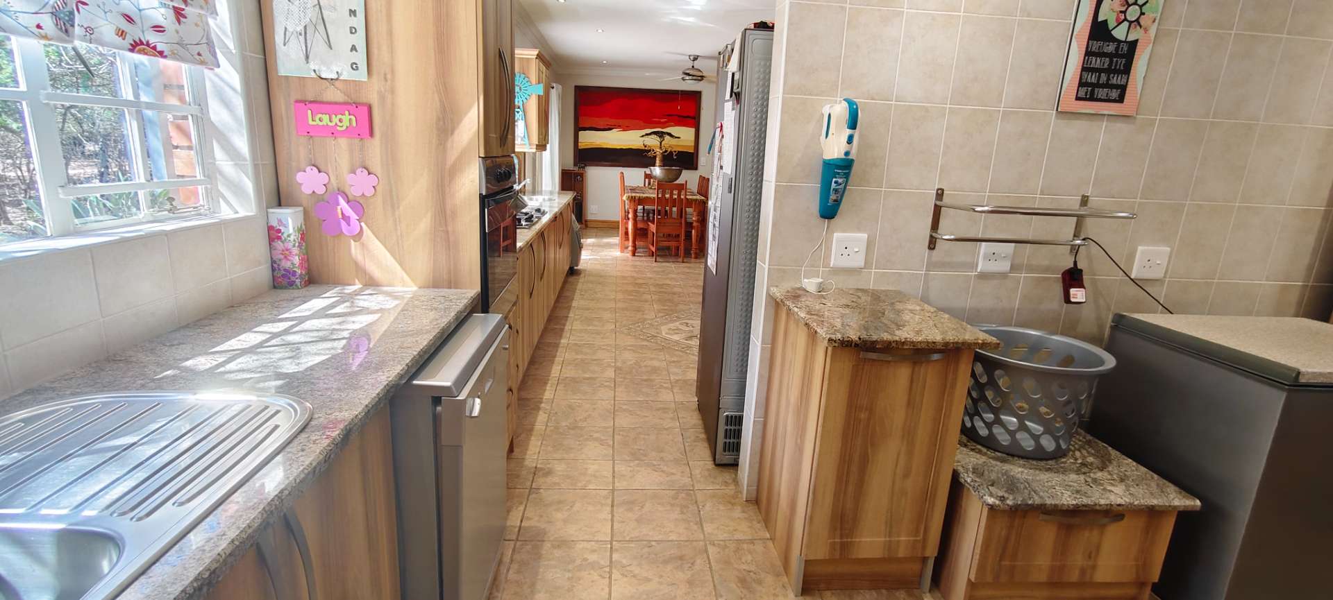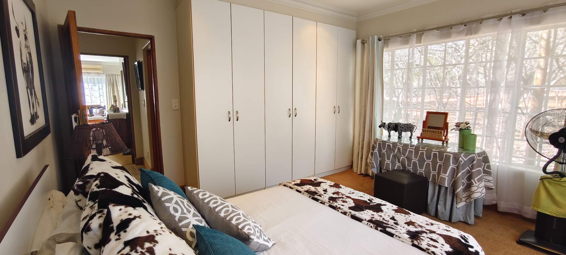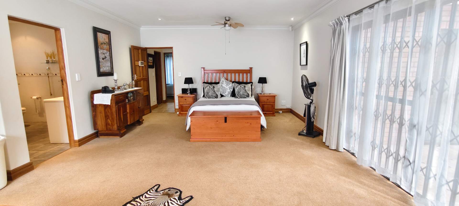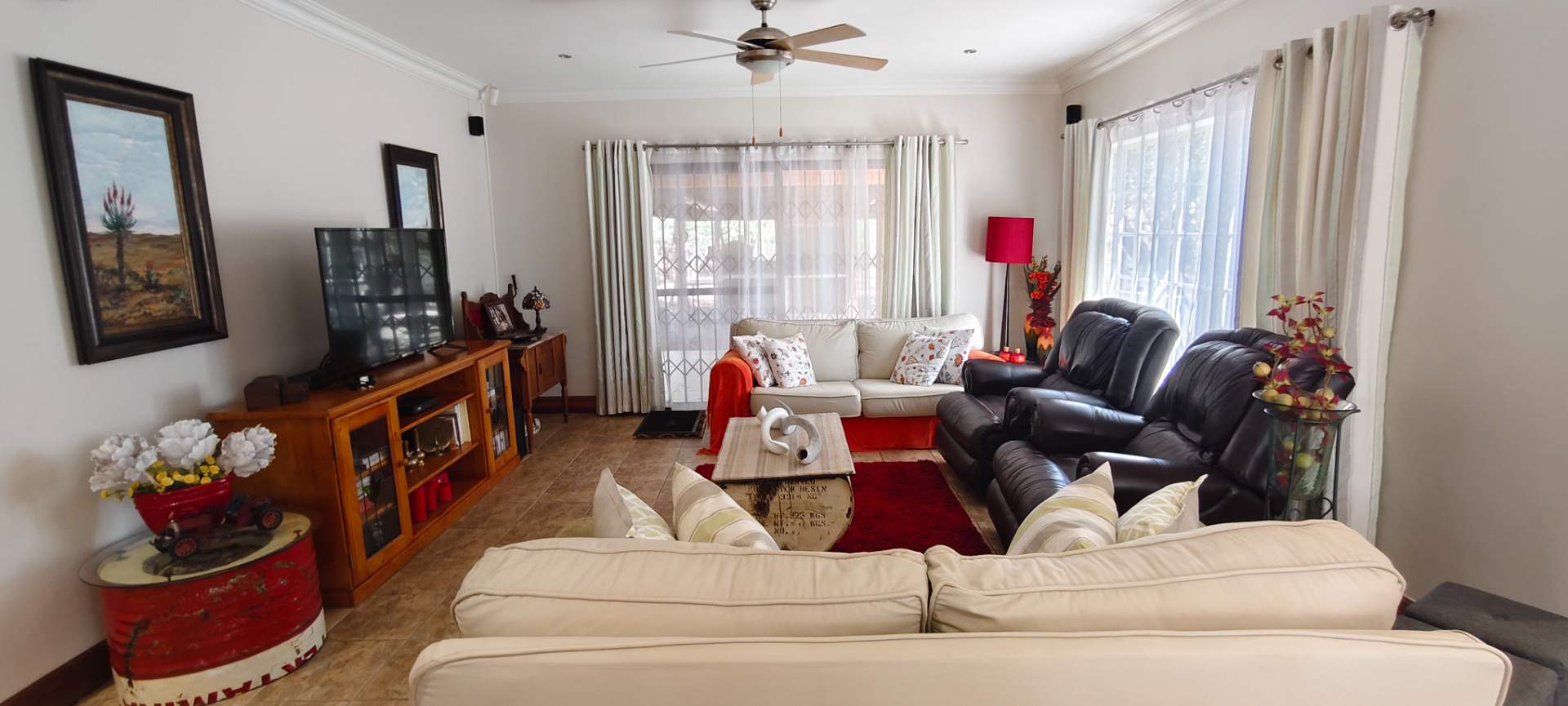 Step into a spacious open-plan living area that seamlessly combines the lounge, dining room, and kitchen, all enhanced with modern downlights and ceiling fans for optimal comfort. Sliding doors, equipped with insect screens and burglar bars, lead you from the lounge and dining room to exquisite entertainment areas, ensuring both safety and enjoyment.