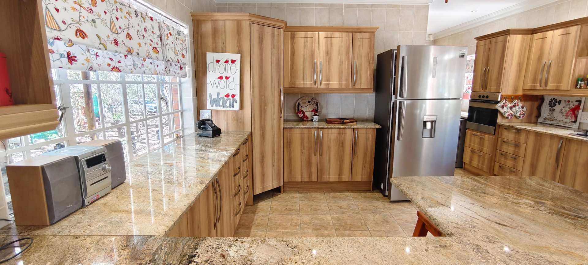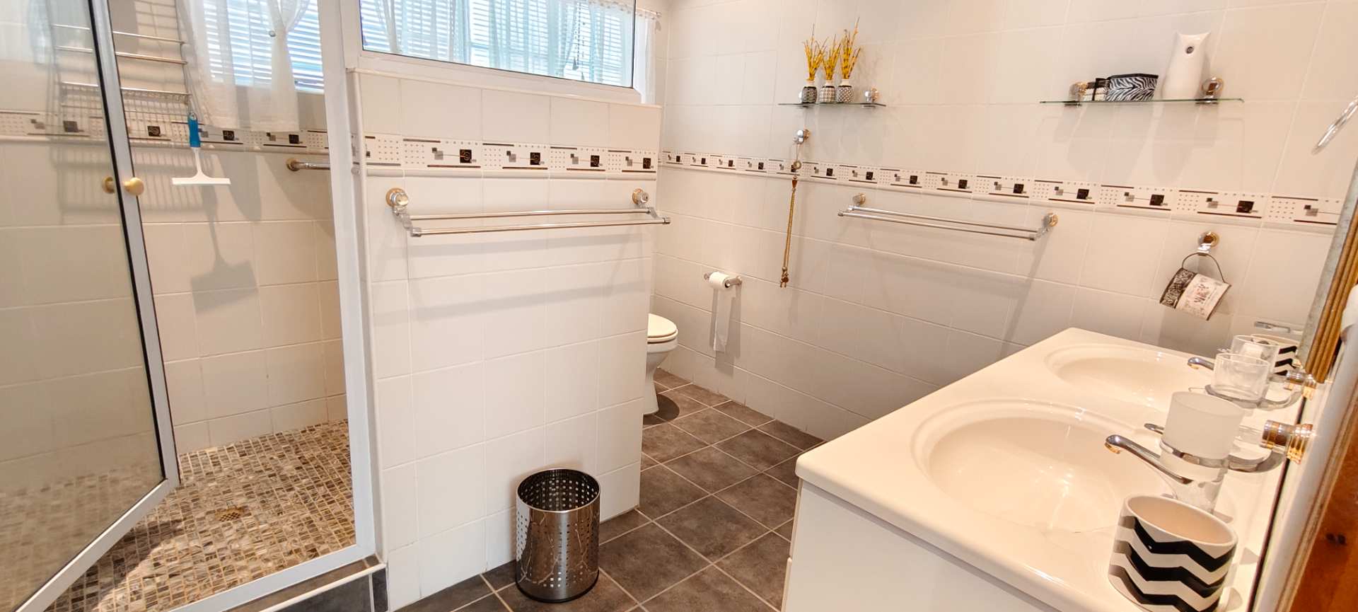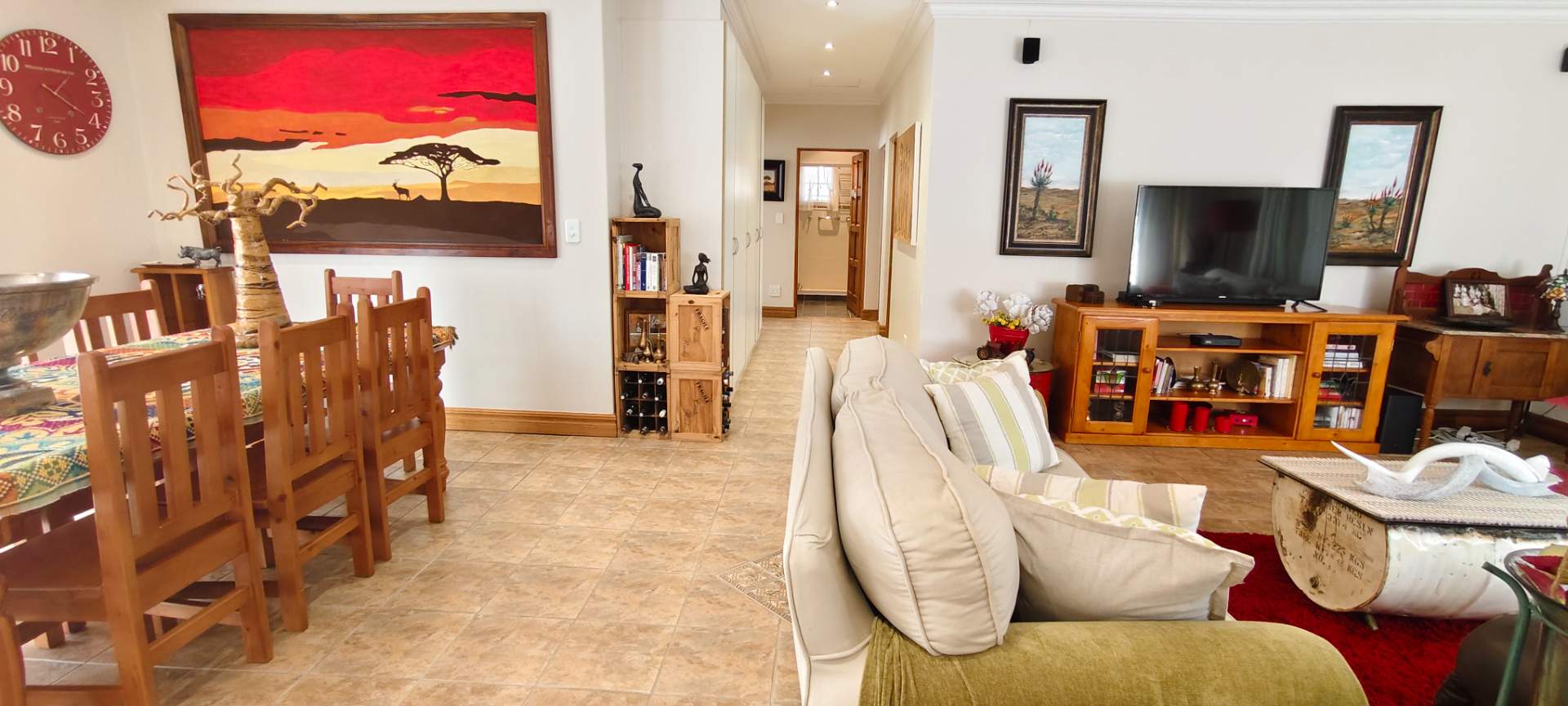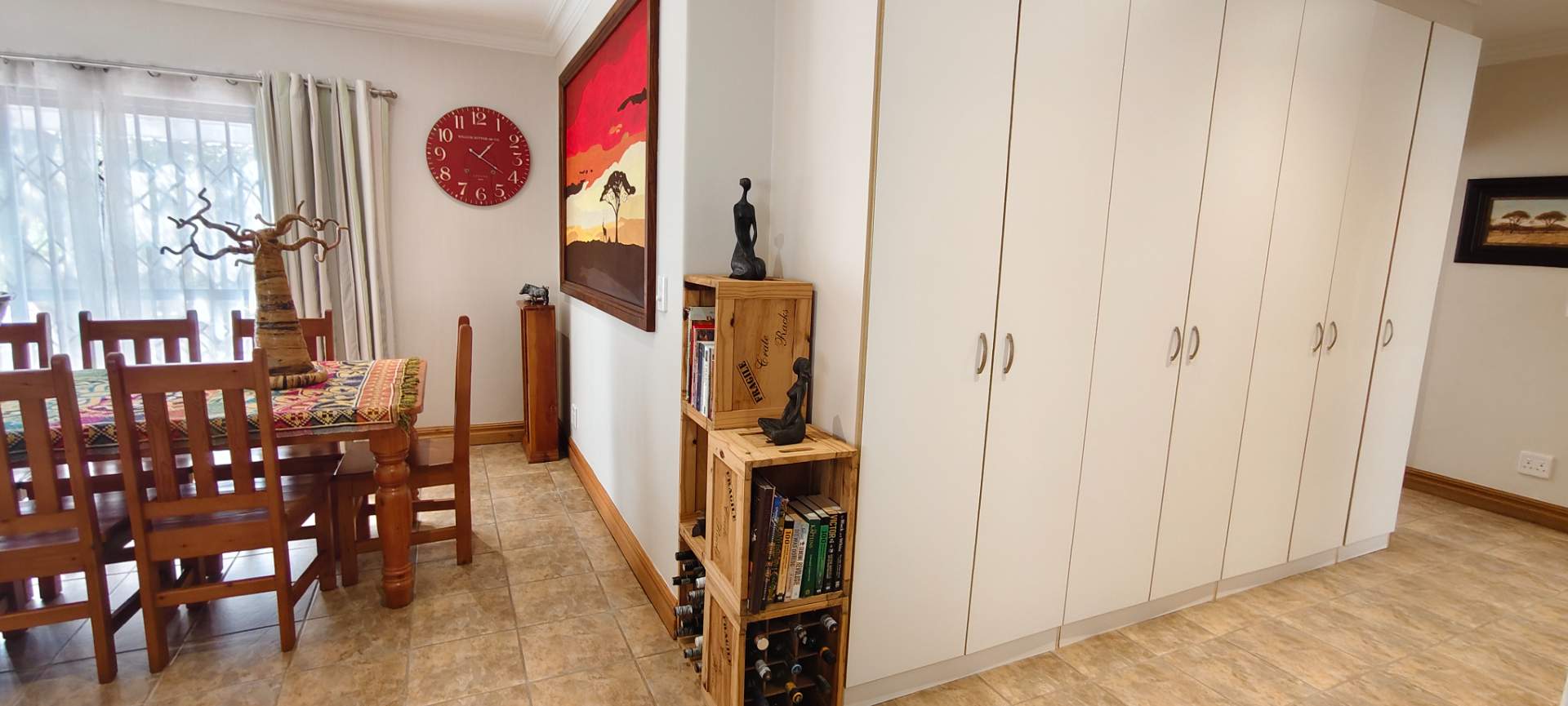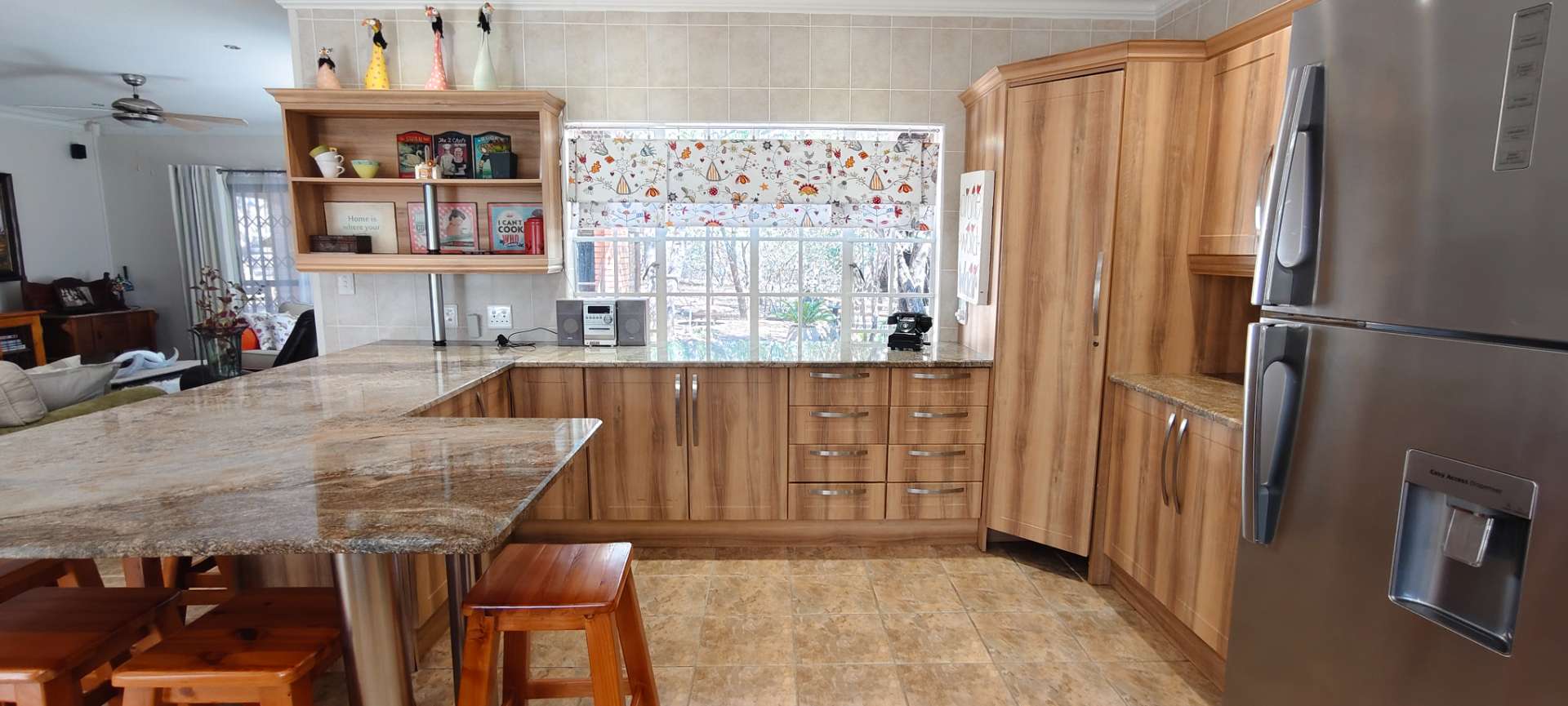 Step into a spacious open-plan living area that seamlessly combines the lounge, dining room, and kitchen, all enhanced with modern downlights and ceiling fans for optimal comfort. Sliding doors, equipped with insect screens and burglar bars, lead you from the lounge and dining room to exquisite entertainment areas, ensuring both safety and enjoyment.