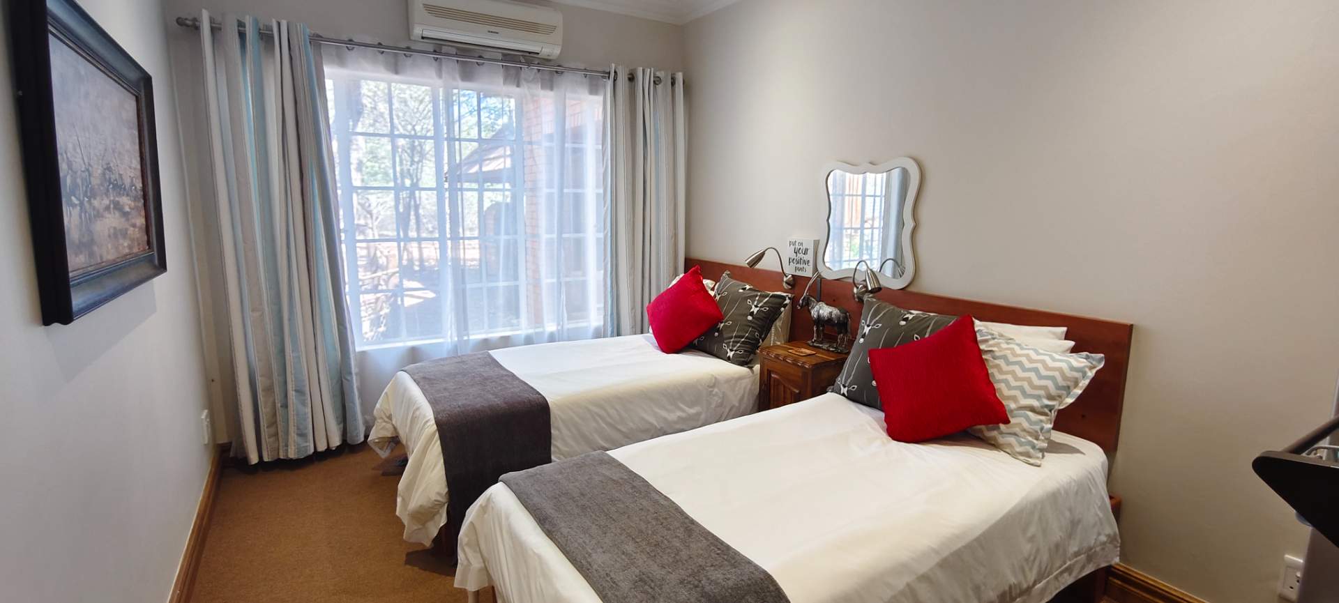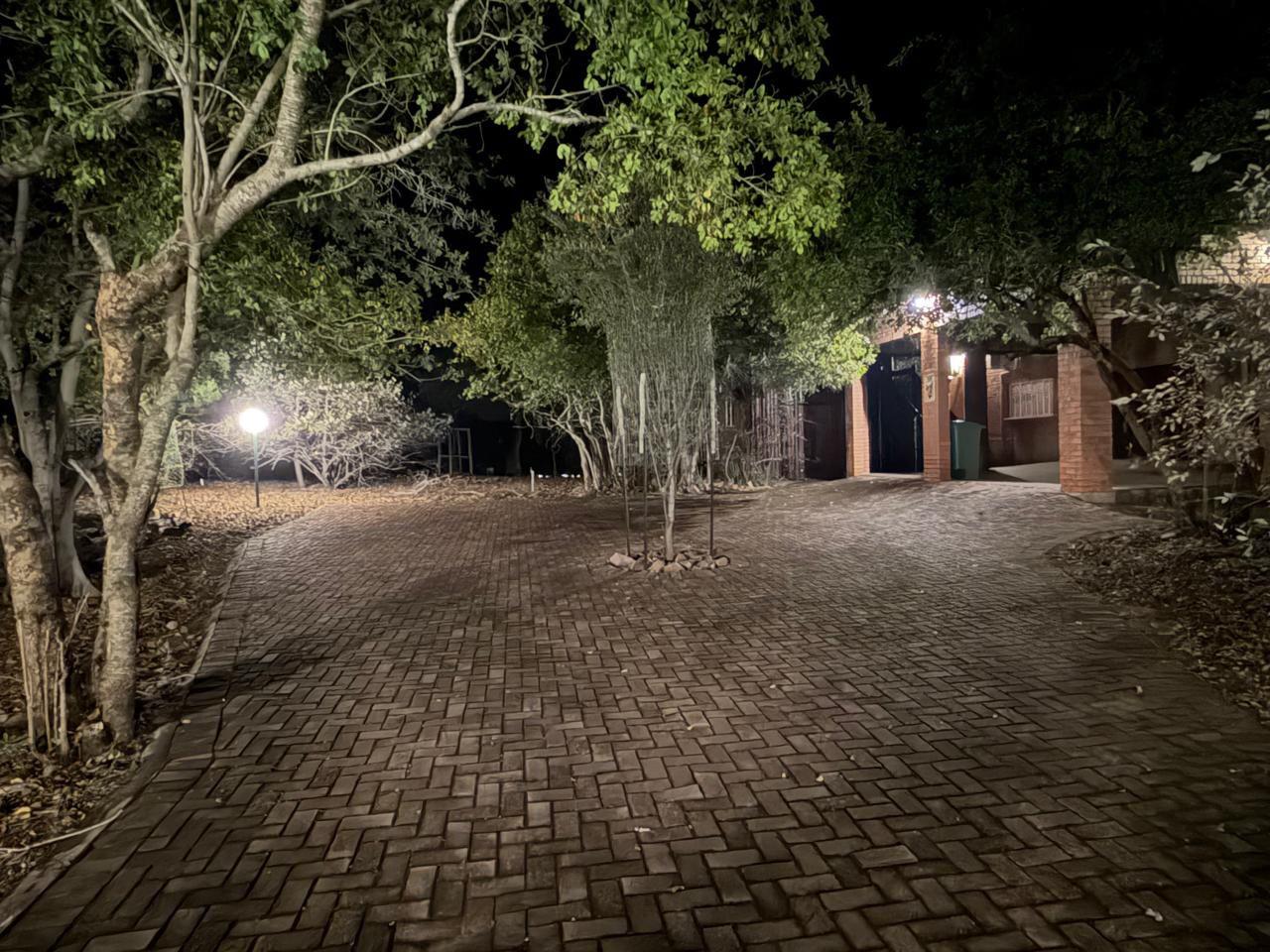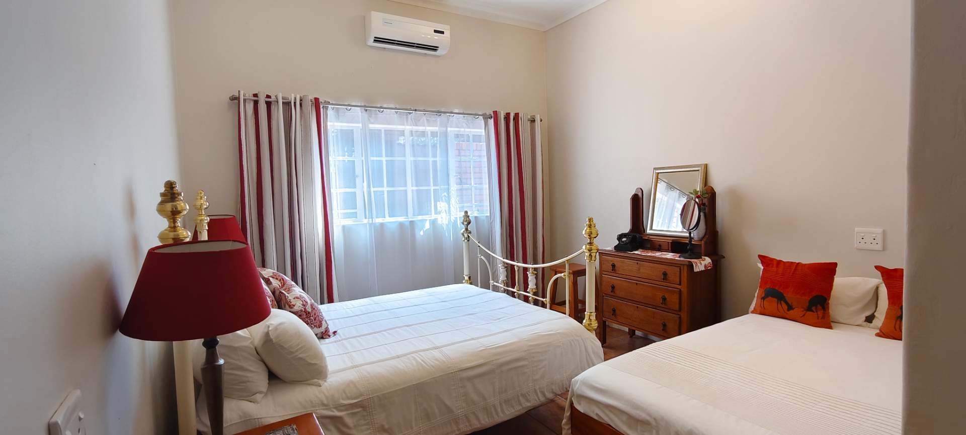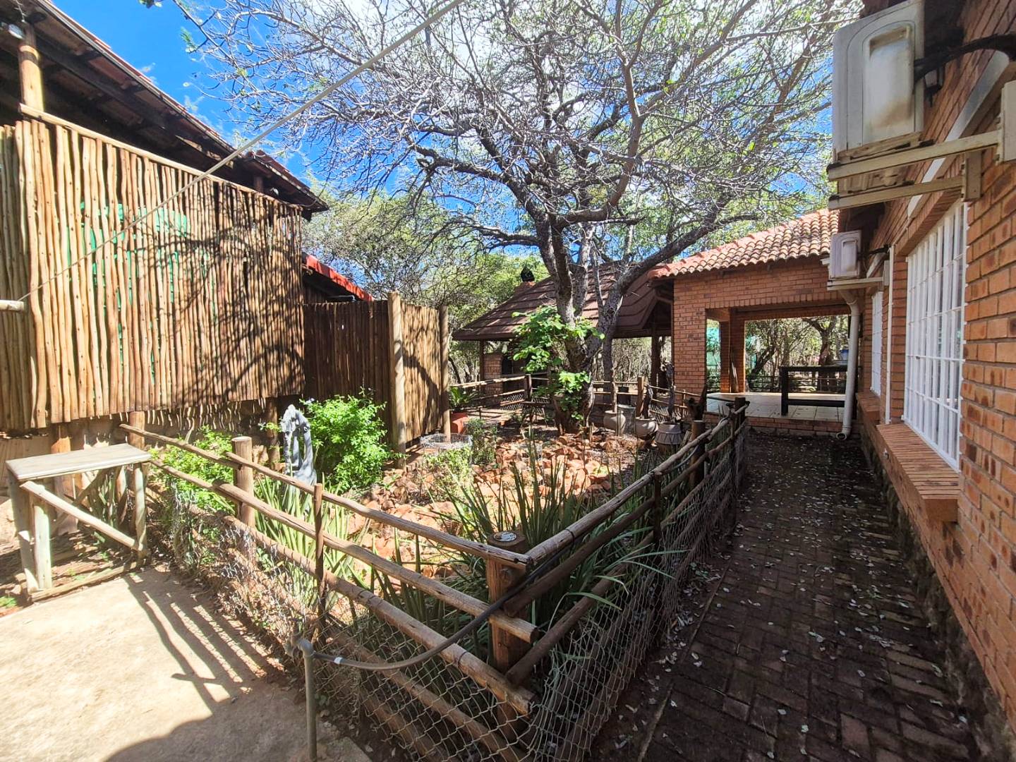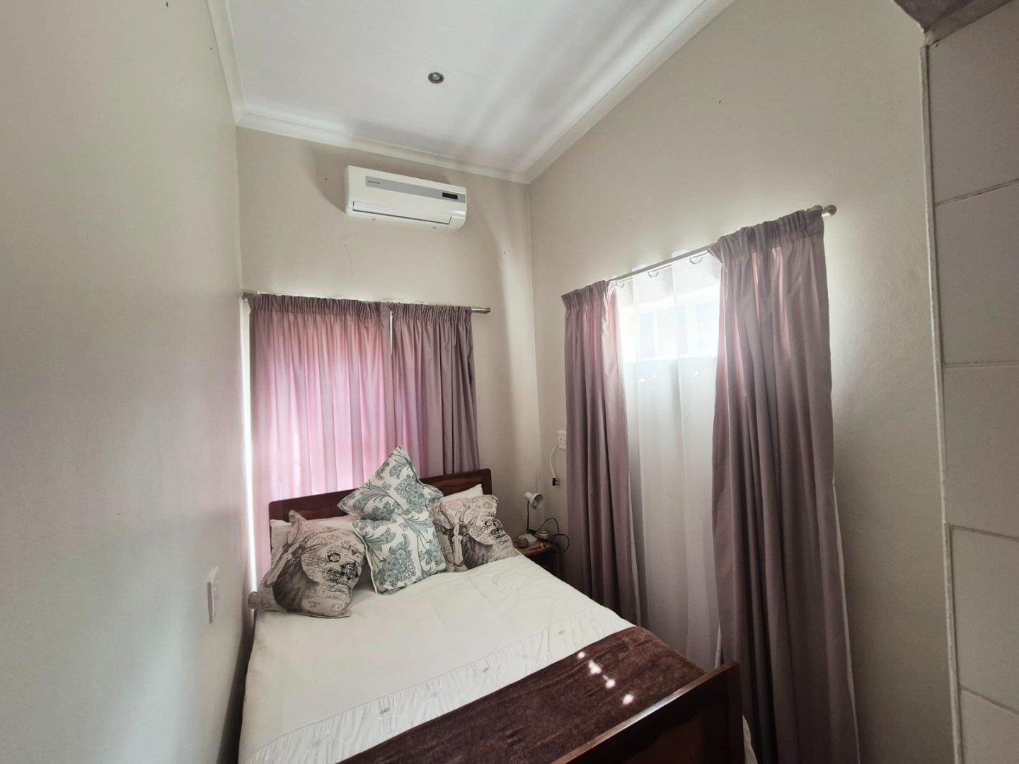 The property features two additional bedrooms outside the main house. One has an entrance from the garage and includes an air conditioner, toilet, and basin. The other is a flatlet with an air conditioner and bathroom, perfect for guests or extended family.