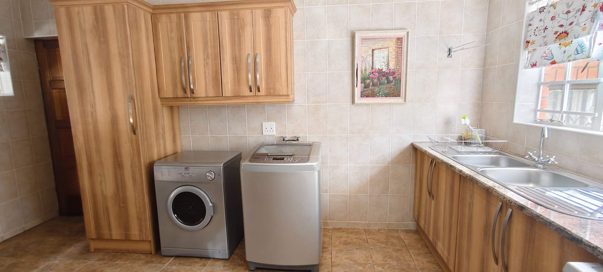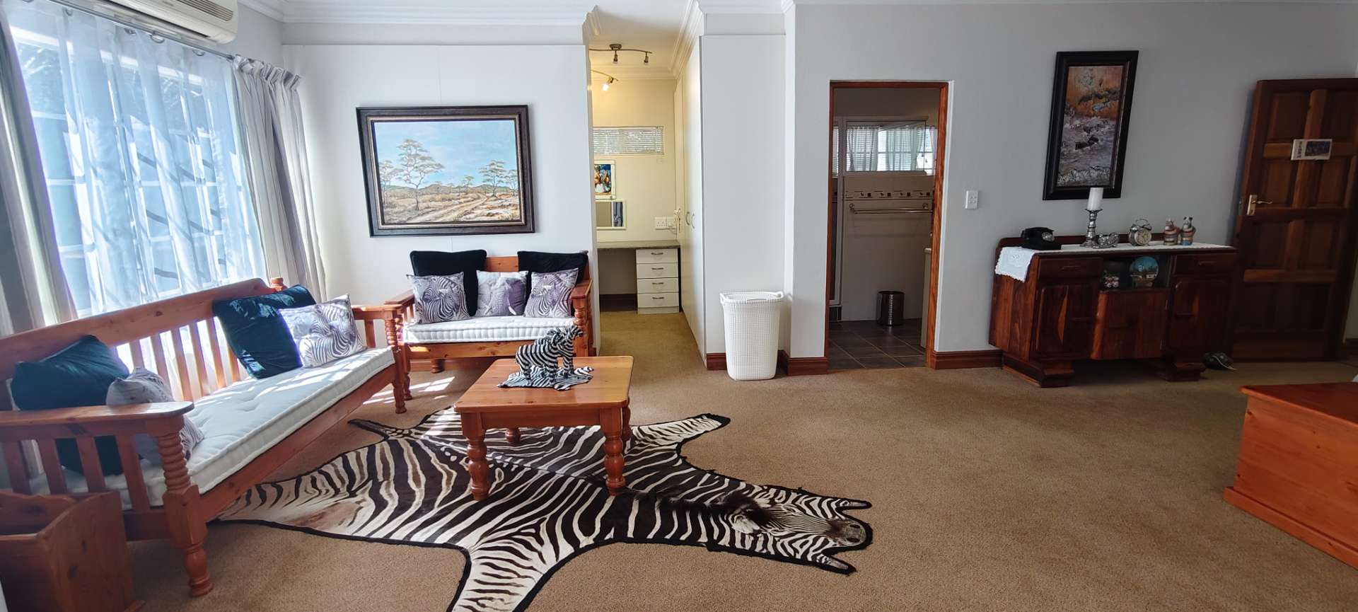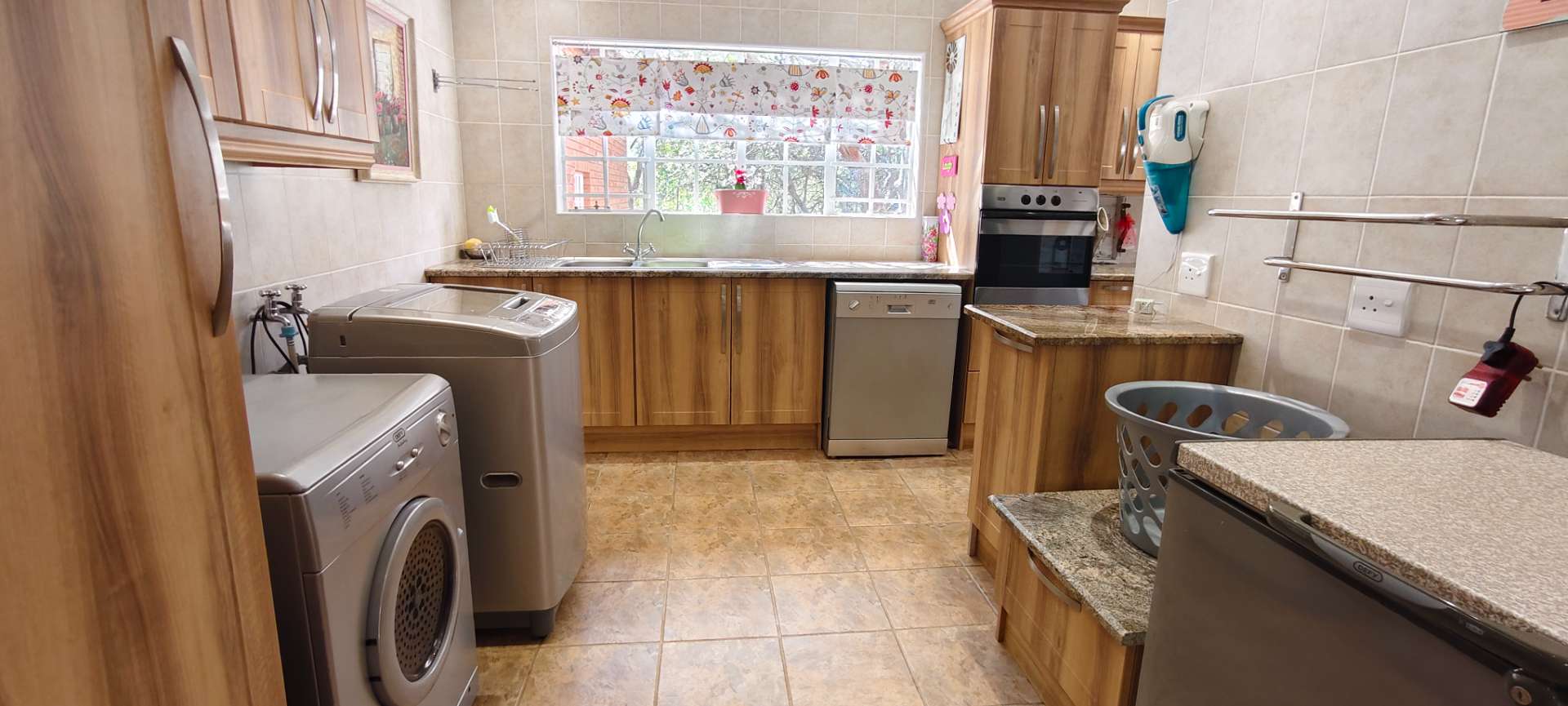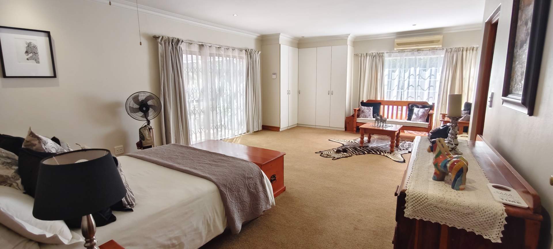The property features two additional bedrooms outside the main house. One has an entrance from the garage and includes an air conditioner, toilet, and basin. The other is a flatlet with an air conditioner and bathroom, perfect for guests or extended family.