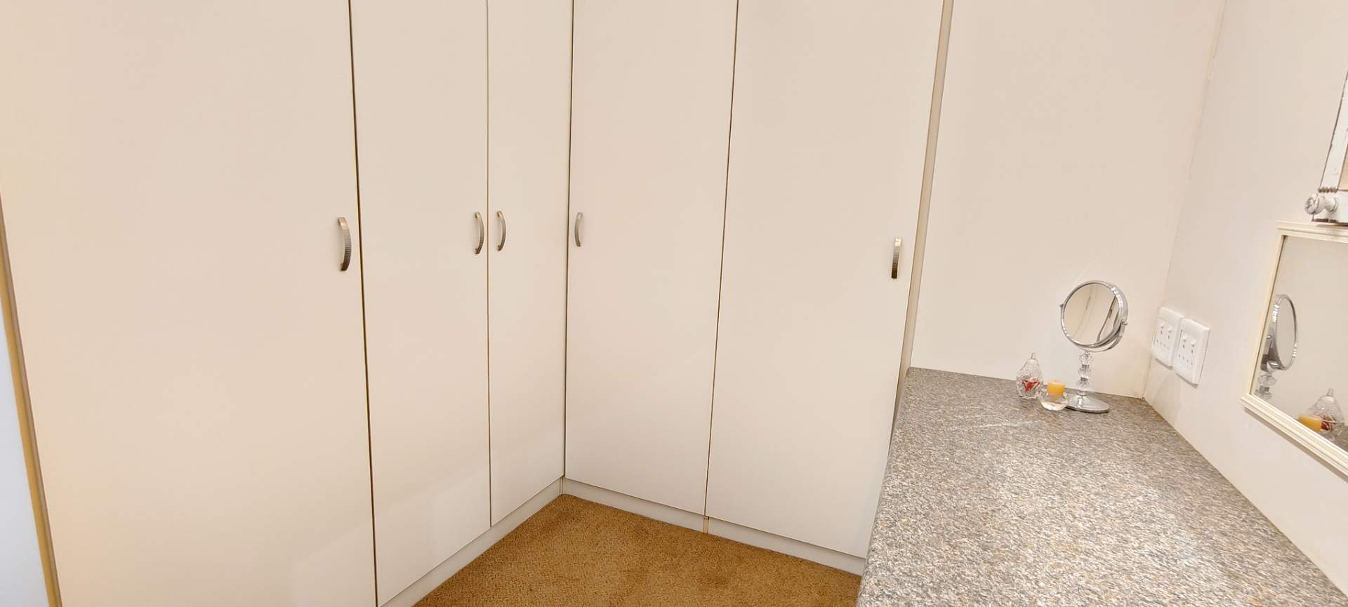 The kitchen is a chef's dream, boasting granite countertops, a gas hob, and a corner unit with a water purifier system. Ample cupboards provide generous storage space, while a cozy nook and separate laundry area offer convenience for all your household needs.