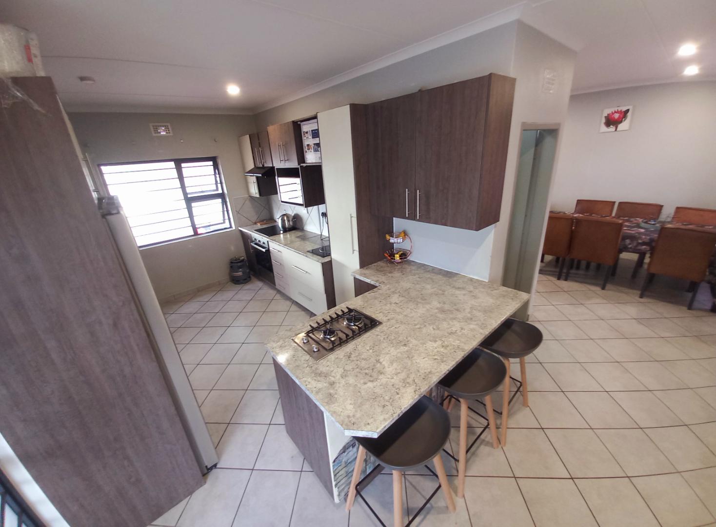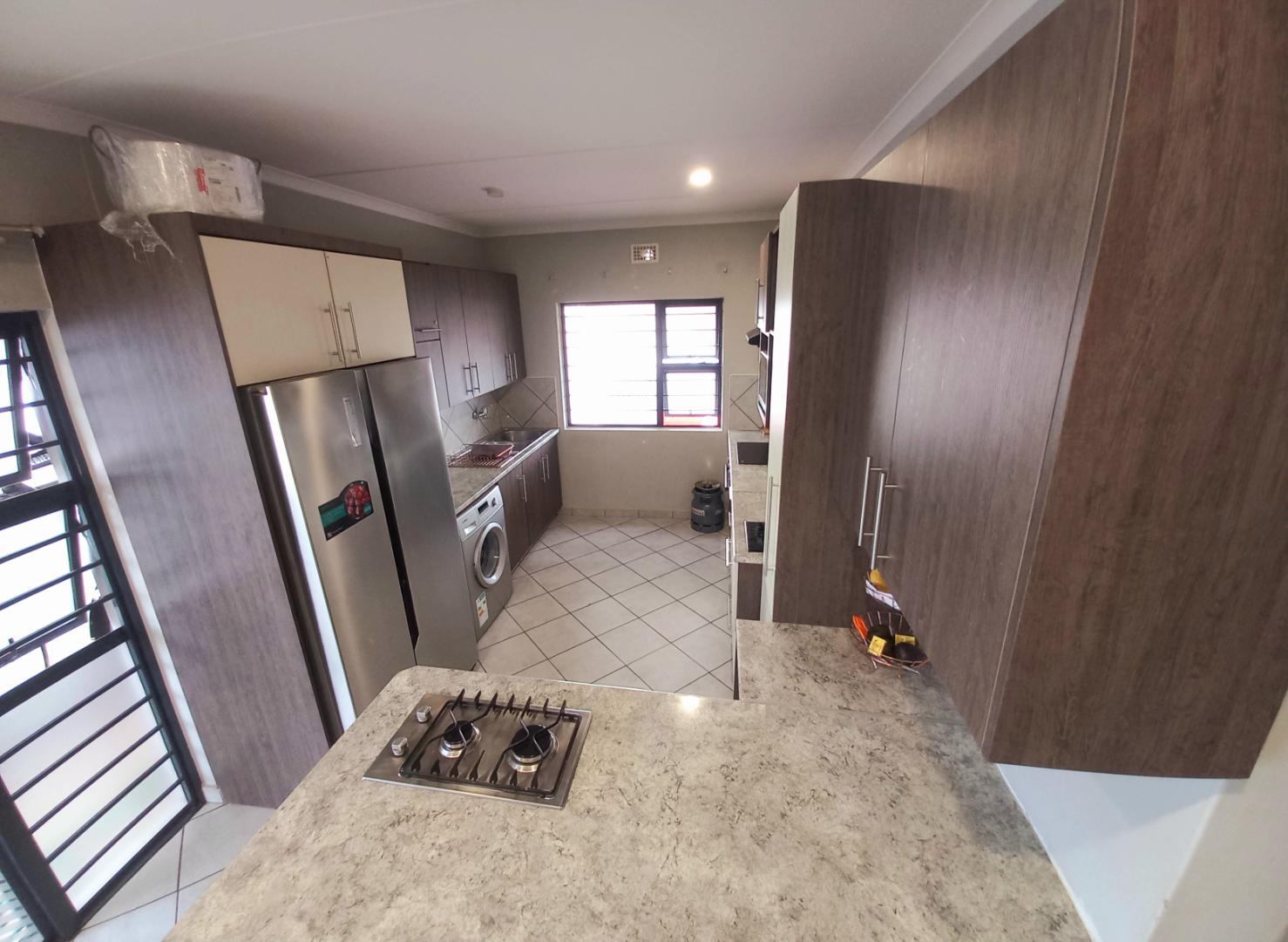 The heart of the home features an open-plan kitchen, tastefully fitted with modern units, and equipped with both a separate gas stove and an electric stove to cater to all your culinary needs. The open-plan design extends to a welcoming sitting room and dining area, perfect for entertaining family and friends.