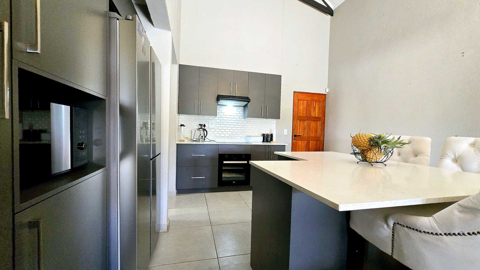 The kitchen is well equipped with ample cupboard space and a separate scullery, keeping the main kitchen area neat and functional.