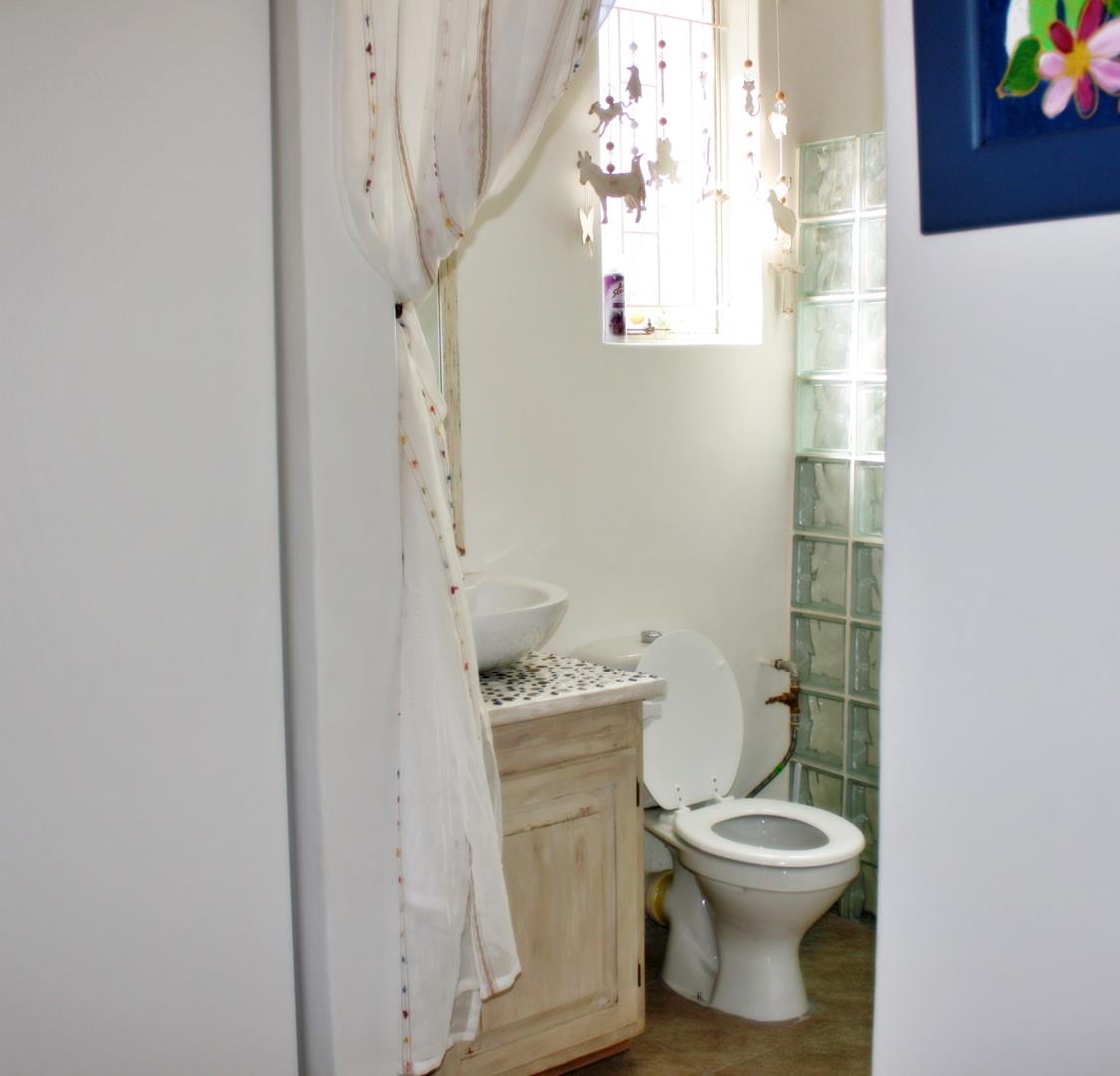 > Outside washroom with toilet and basin.