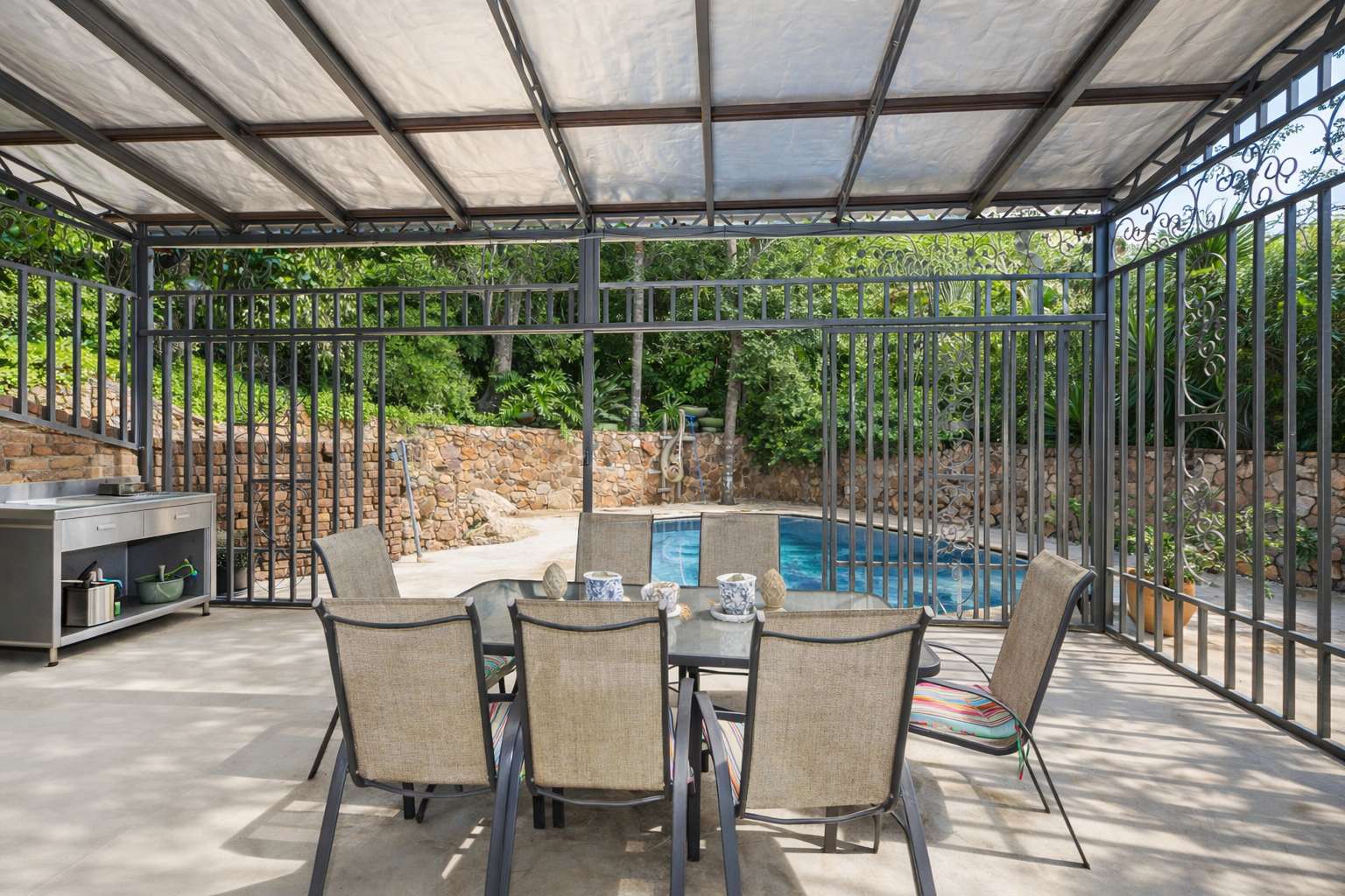 Enjoy outdoor living at its finest with an enclosed patio that overlooks a sparkling swimming pool, offering a serene setting for gatherings or quiet moments of reflection.