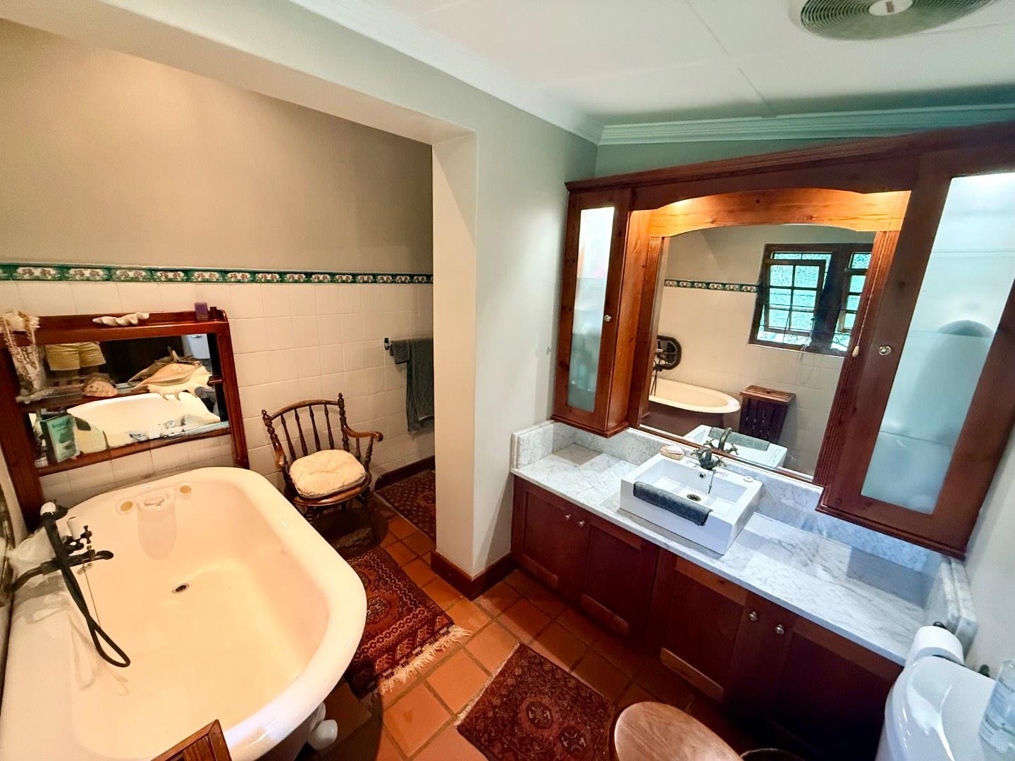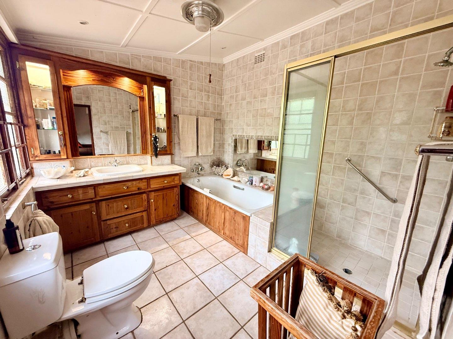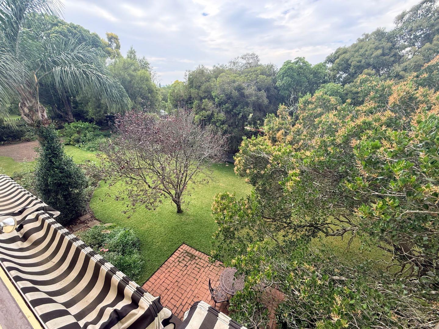 A stunning wooden staircase leads to the second floor, where you will find a guest bedroom and the main suite. Both rooms have access to a balcony overlooking the magnificent garden. The guest bedroom includes built-in cupboards, while the generously sized main suite features its own private lounge area, ample built-in cupboards, and a full en-suite bathroom.