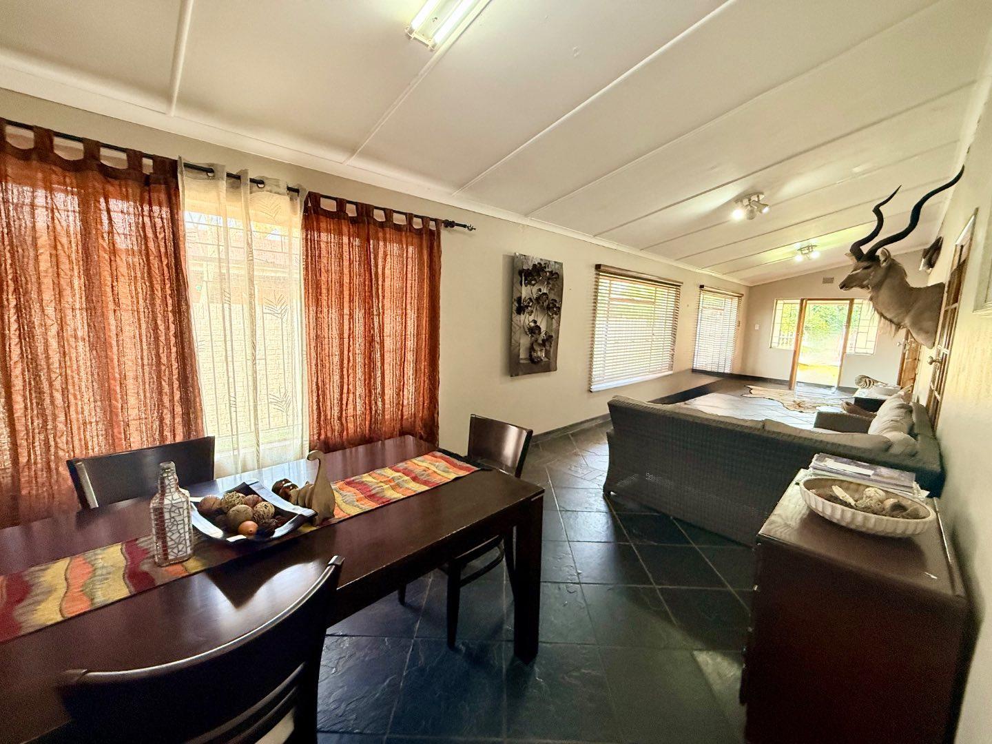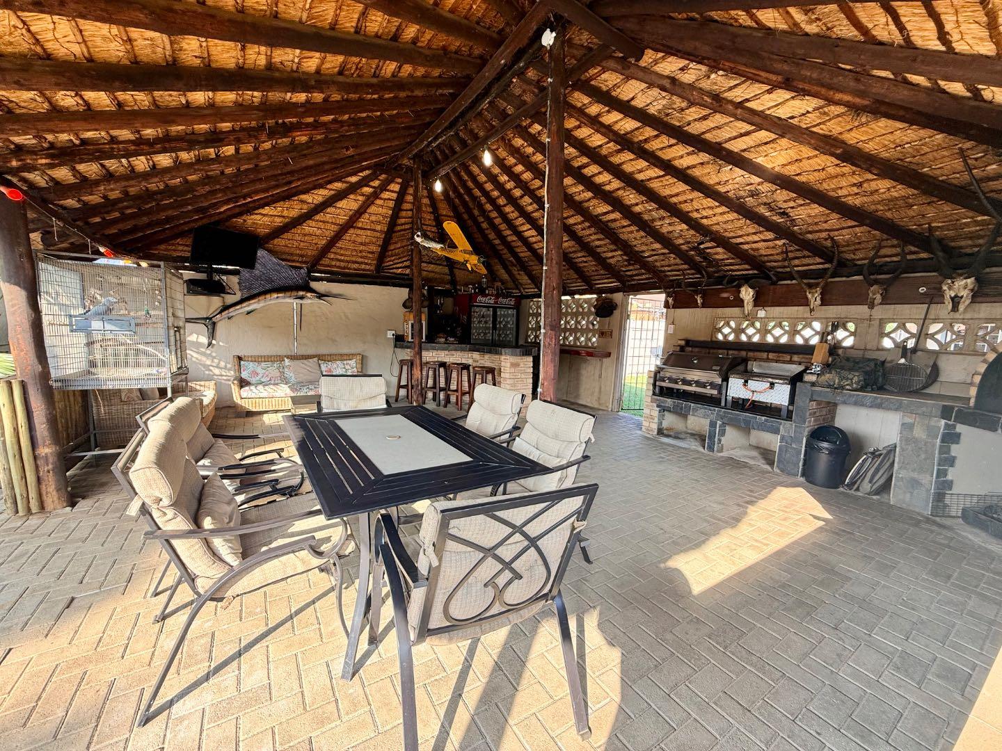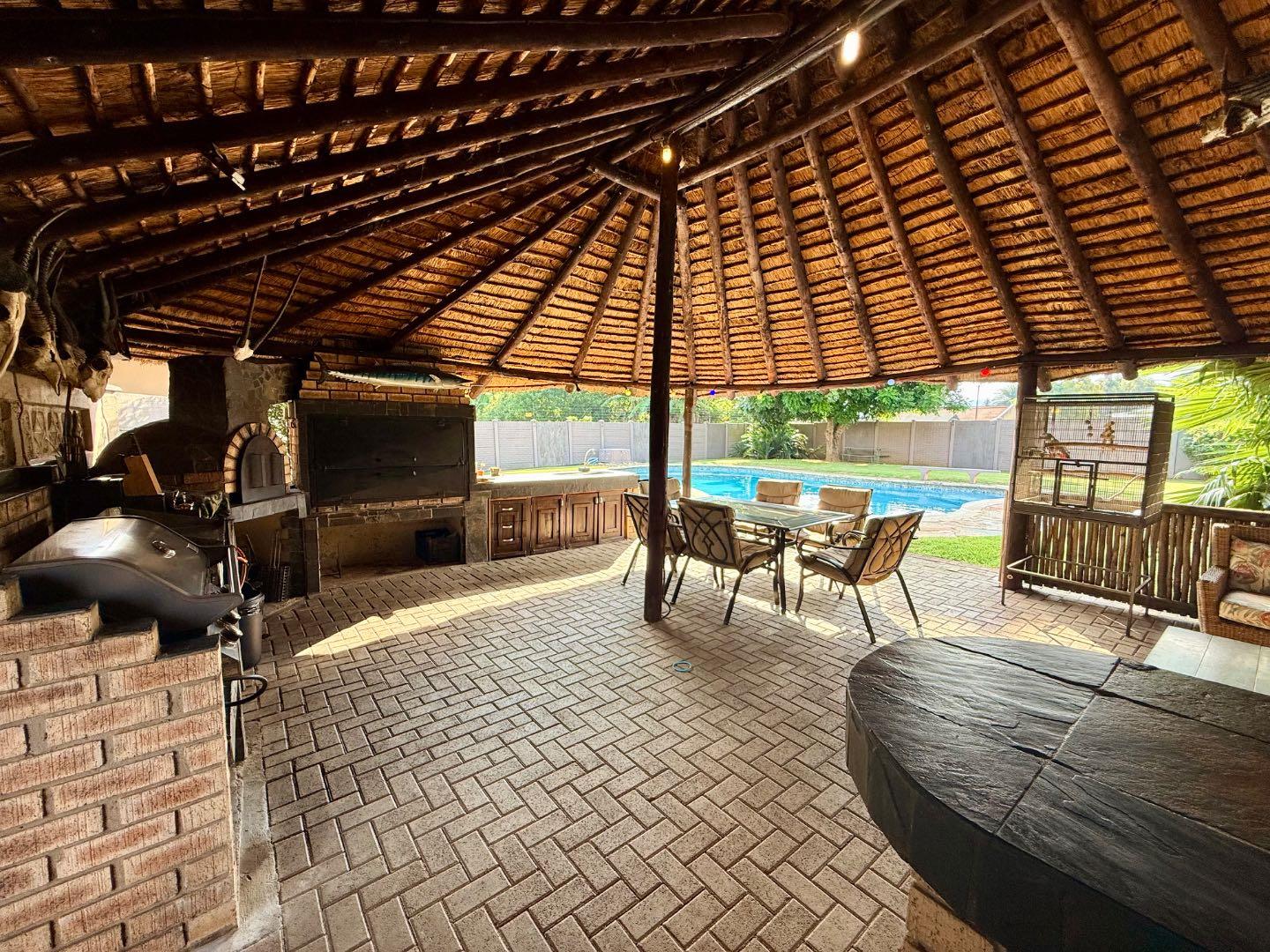 Designed for entertaining, the property boasts a large thatched entertainment area with a built-in braai, overlooking a spacious swimming pool — perfect for hosting family and friends.