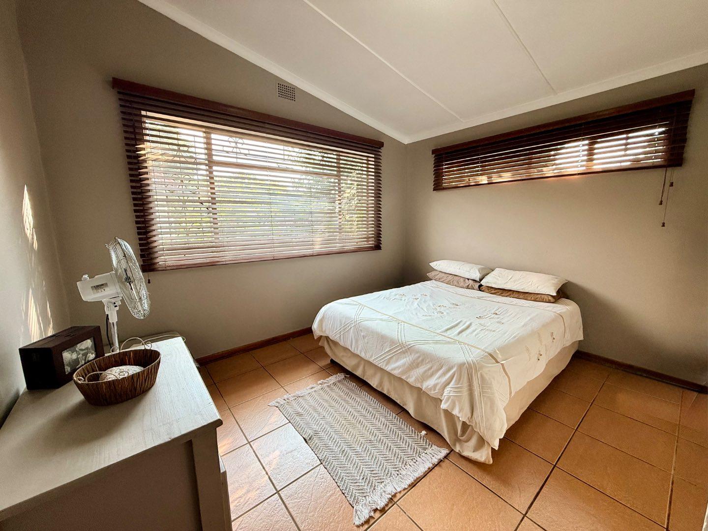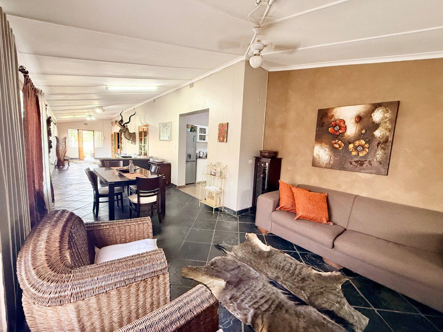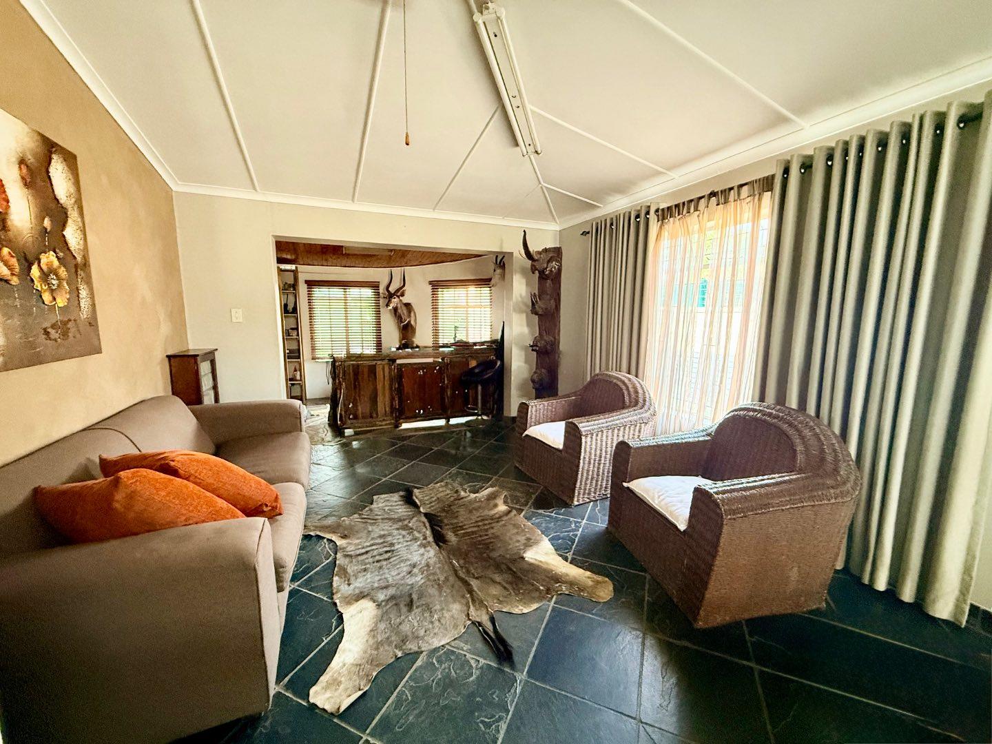 Designed for entertaining, the property boasts a large thatched entertainment area with a built-in braai, overlooking a spacious swimming pool — perfect for hosting family and friends.