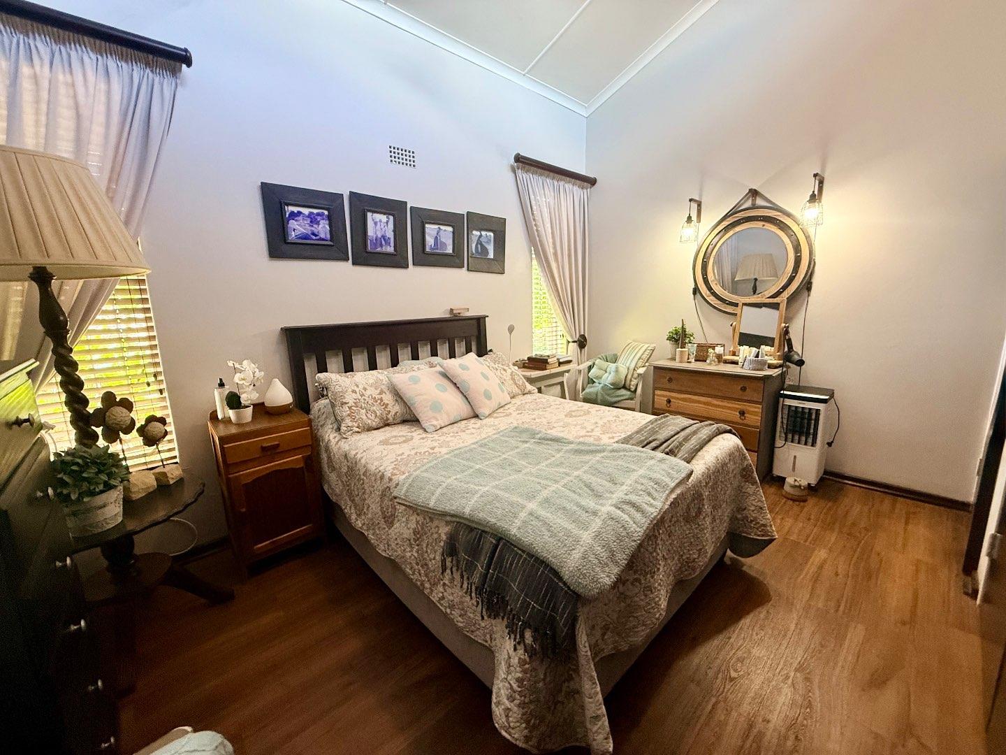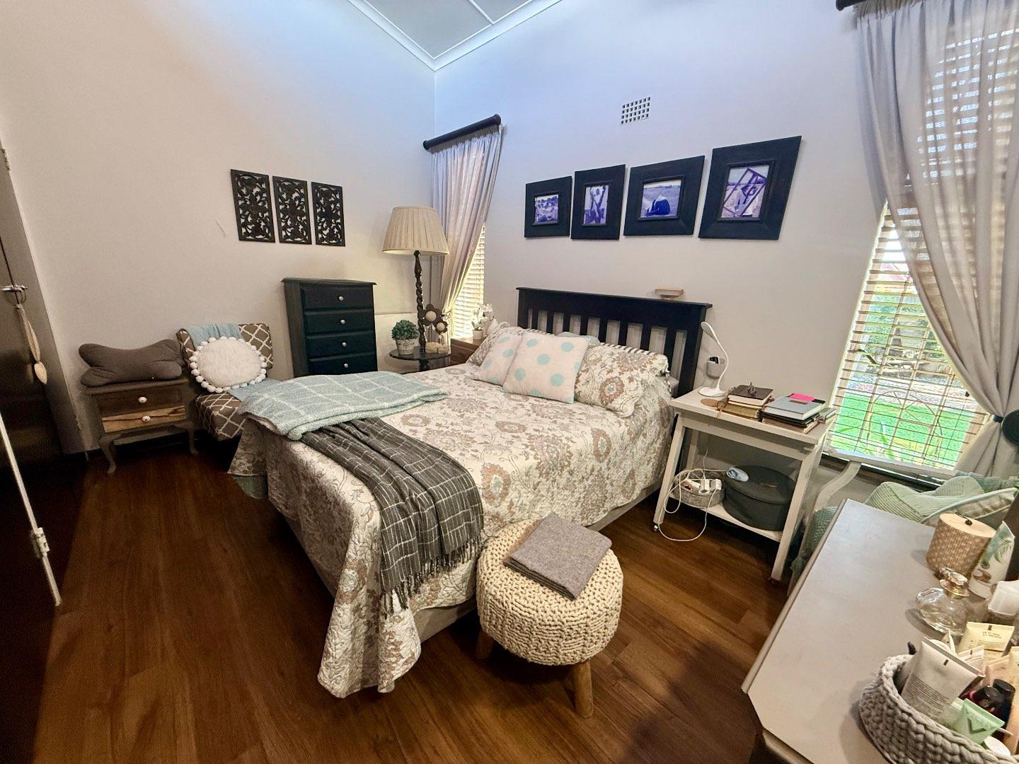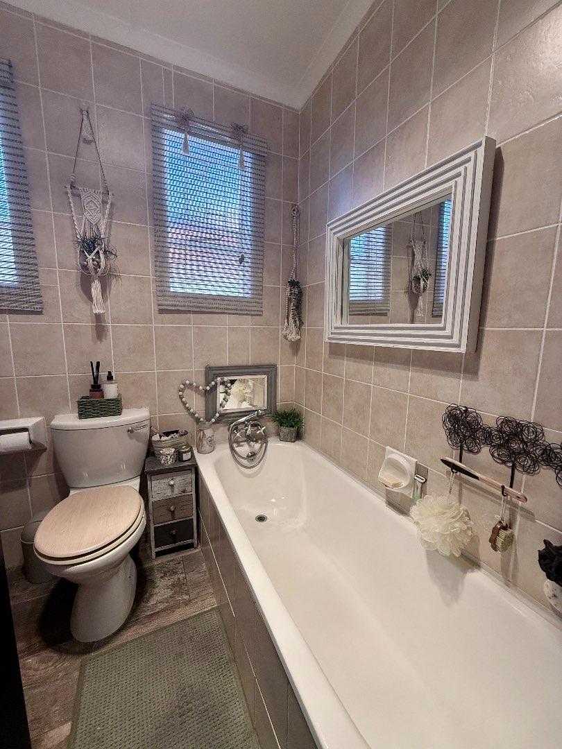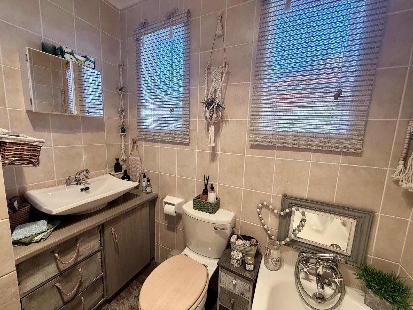 The home features three well-proportioned bedrooms, all fitted with laminated flooring and built-in cupboards. The bathroom includes a bath, basin and toilet, with a separate shower for added convenience.