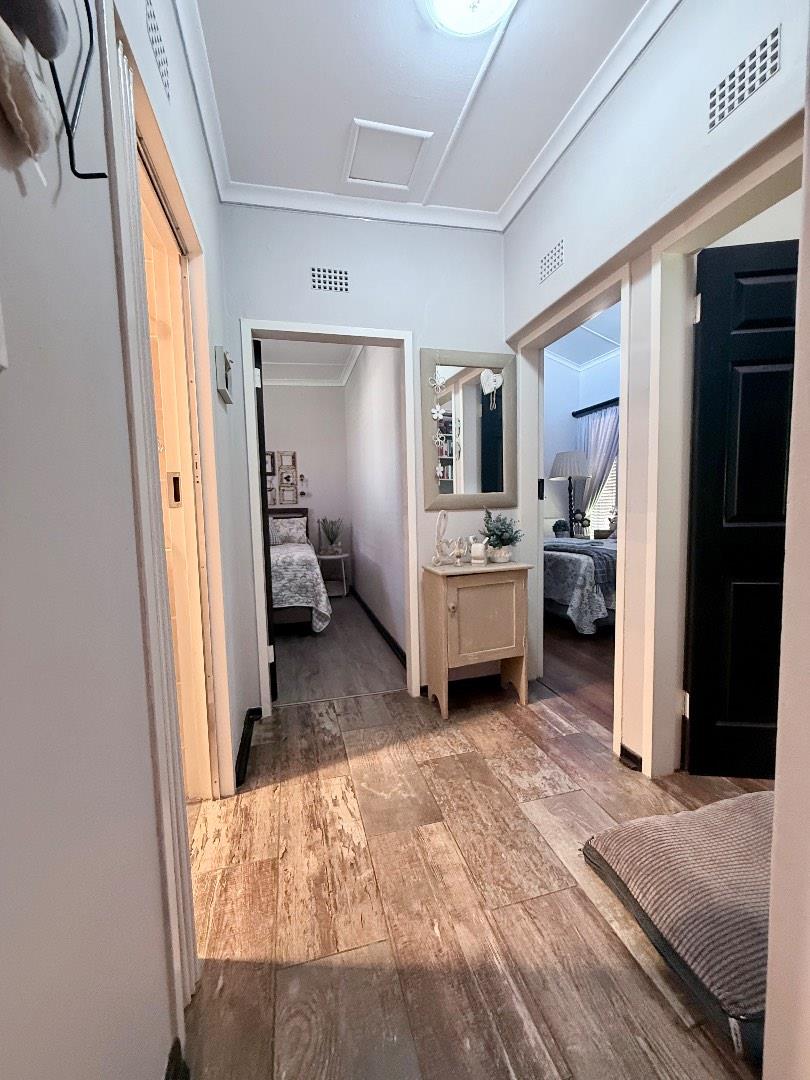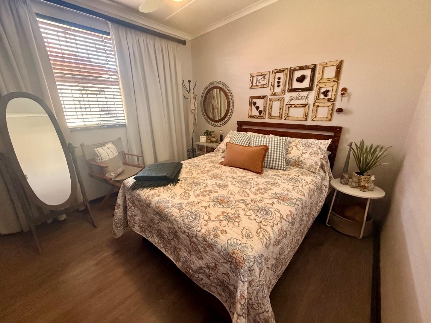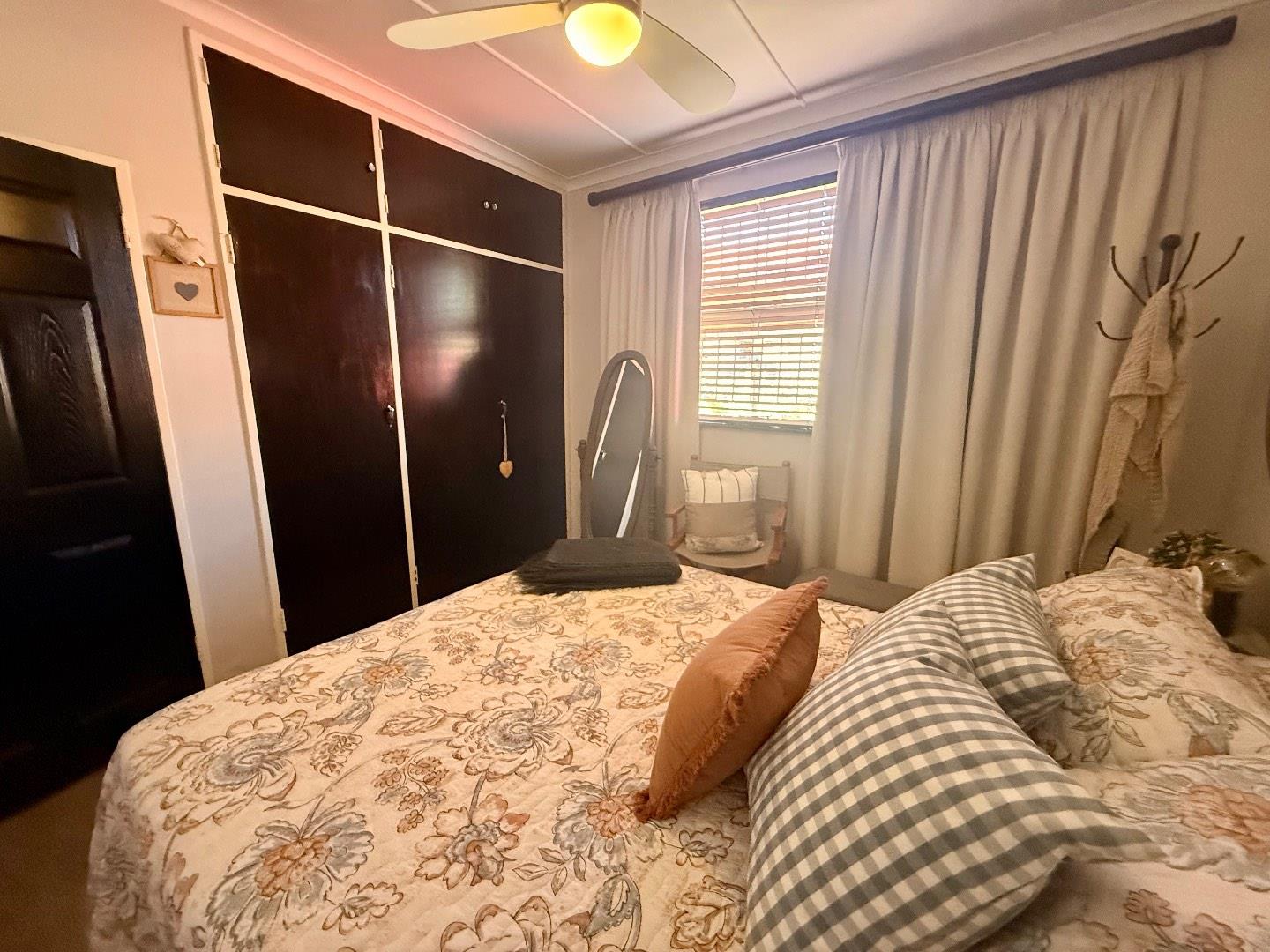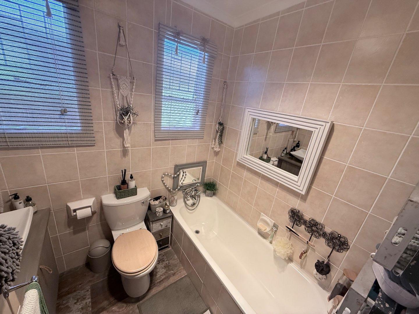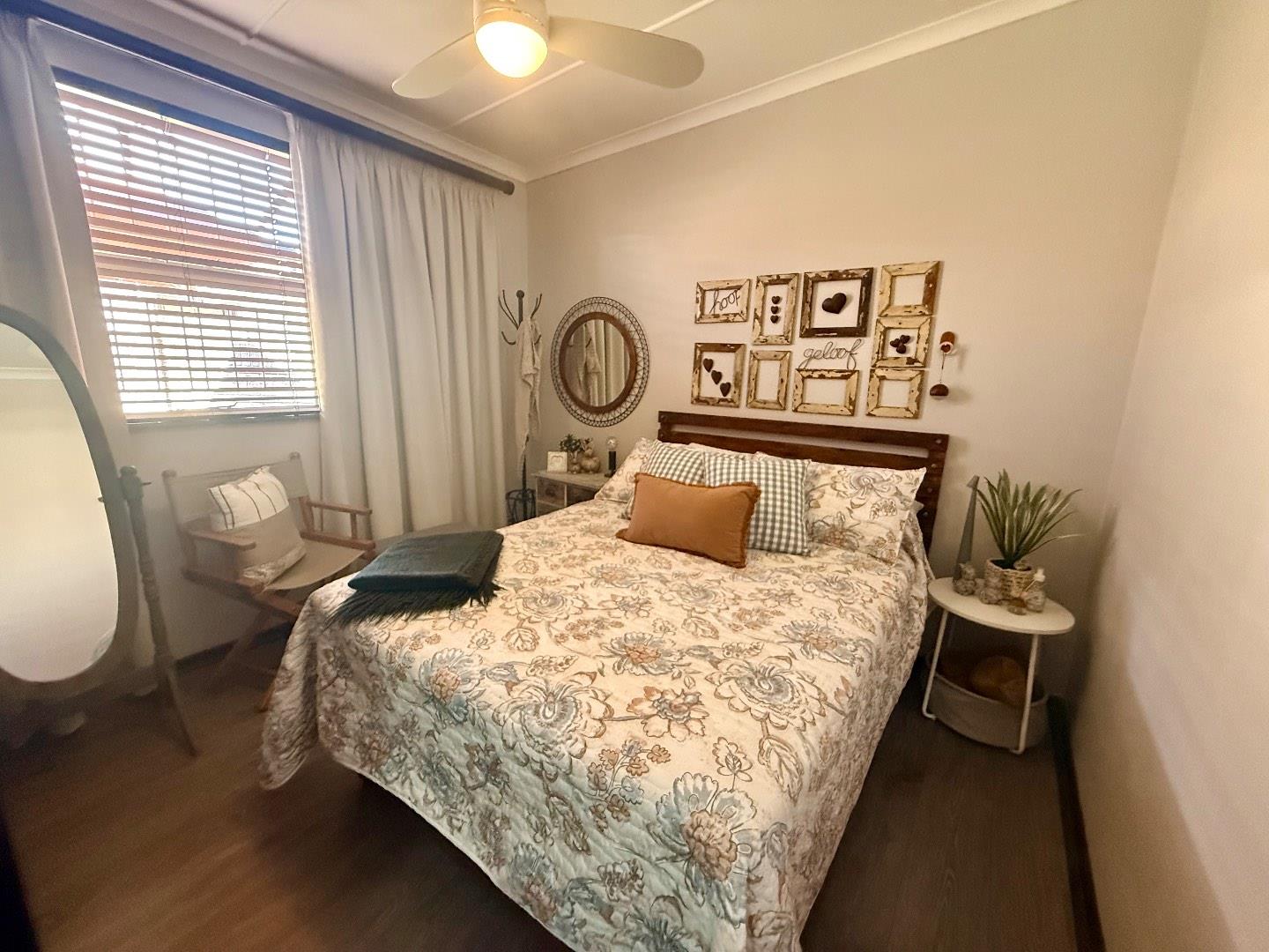 The home features three well-proportioned bedrooms, all fitted with laminated flooring and built-in cupboards. The bathroom includes a bath, basin and toilet, with a separate shower for added convenience.
